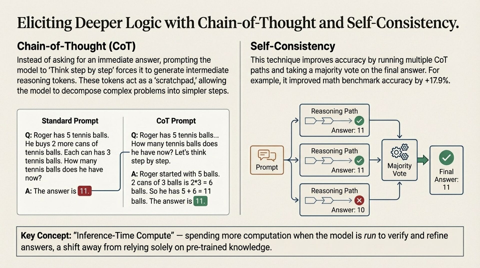 • Chain-of-thought and self-consistency introduce inference-time compute as a design lever, accuracy costs tokens.