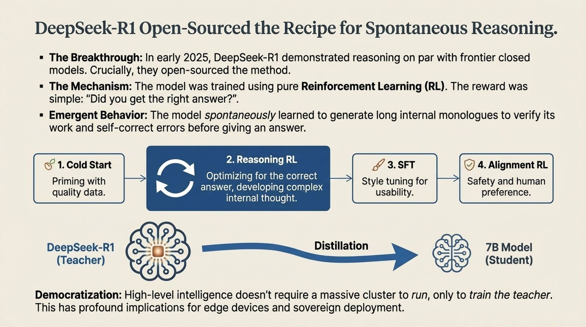 • DeepSeek-R1 open-sources a credible recipe for System 2 style reasoning via reinforcement learning and demonstrates distillation into smaller models, pushing reasoning from cloud-only to edge and commodity deployments.