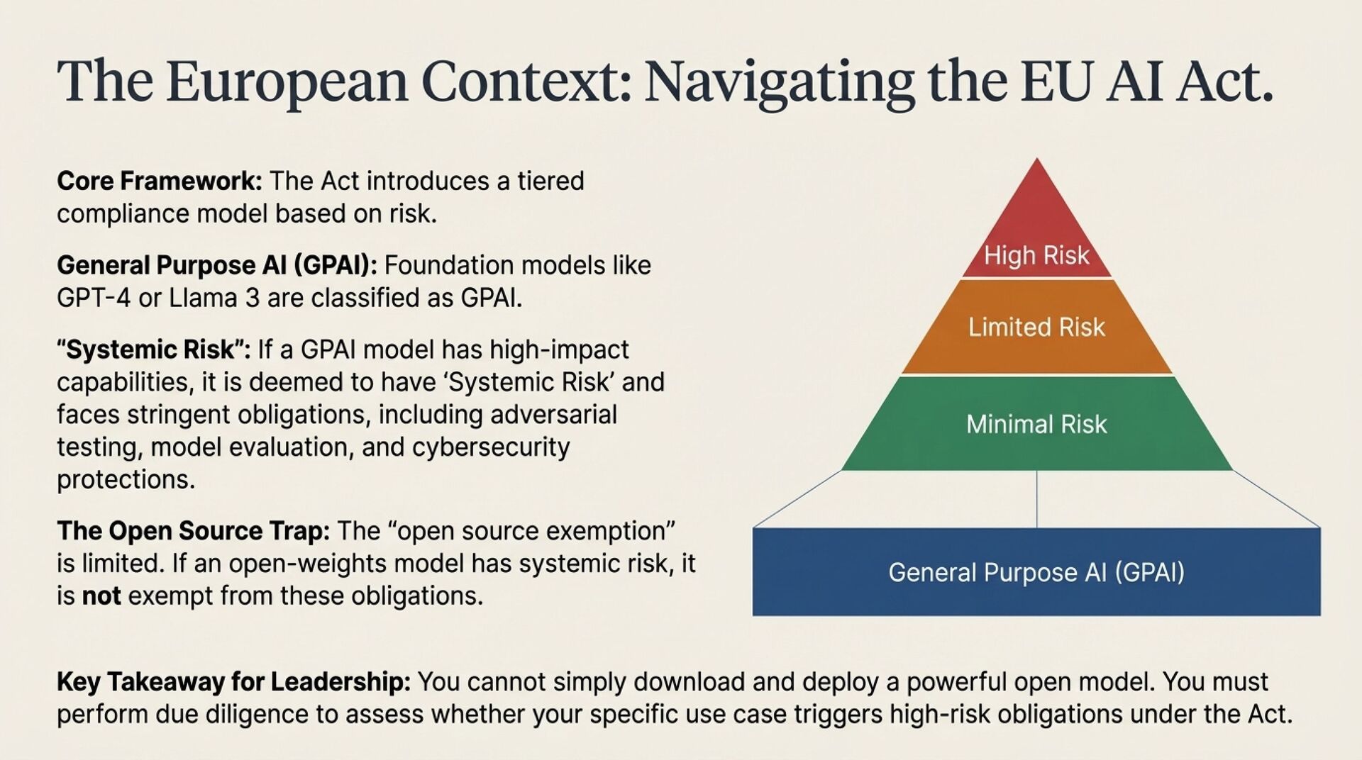 • The EU AI Act makes compliance a design constraint, not a legal afterthought, especially for GPAI and systemic-risk obligations.