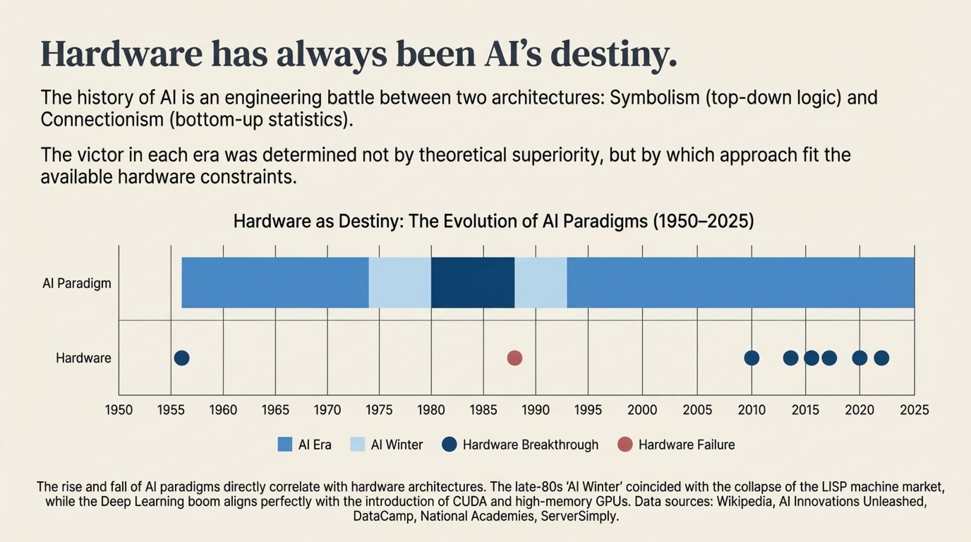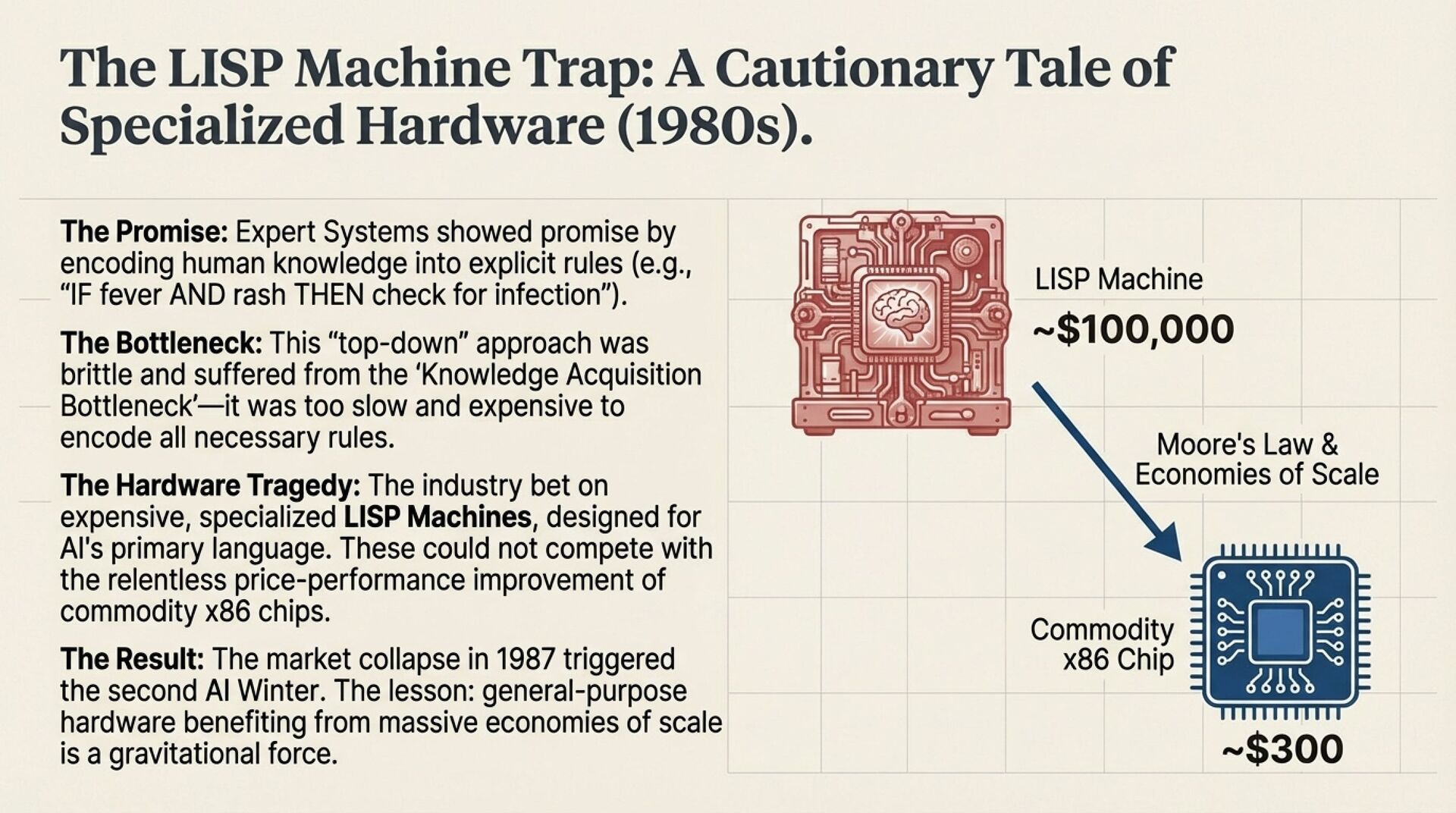 • Symbolic AI did not only fail on theory, it failed on scalability and economics. Expert systems hit the knowledge acquisition bottleneck, and LISP machines lost to commodity x86 price performance. The modern implication is clear, specialized hardware often loses when general-purpose compute reaches massive scale.