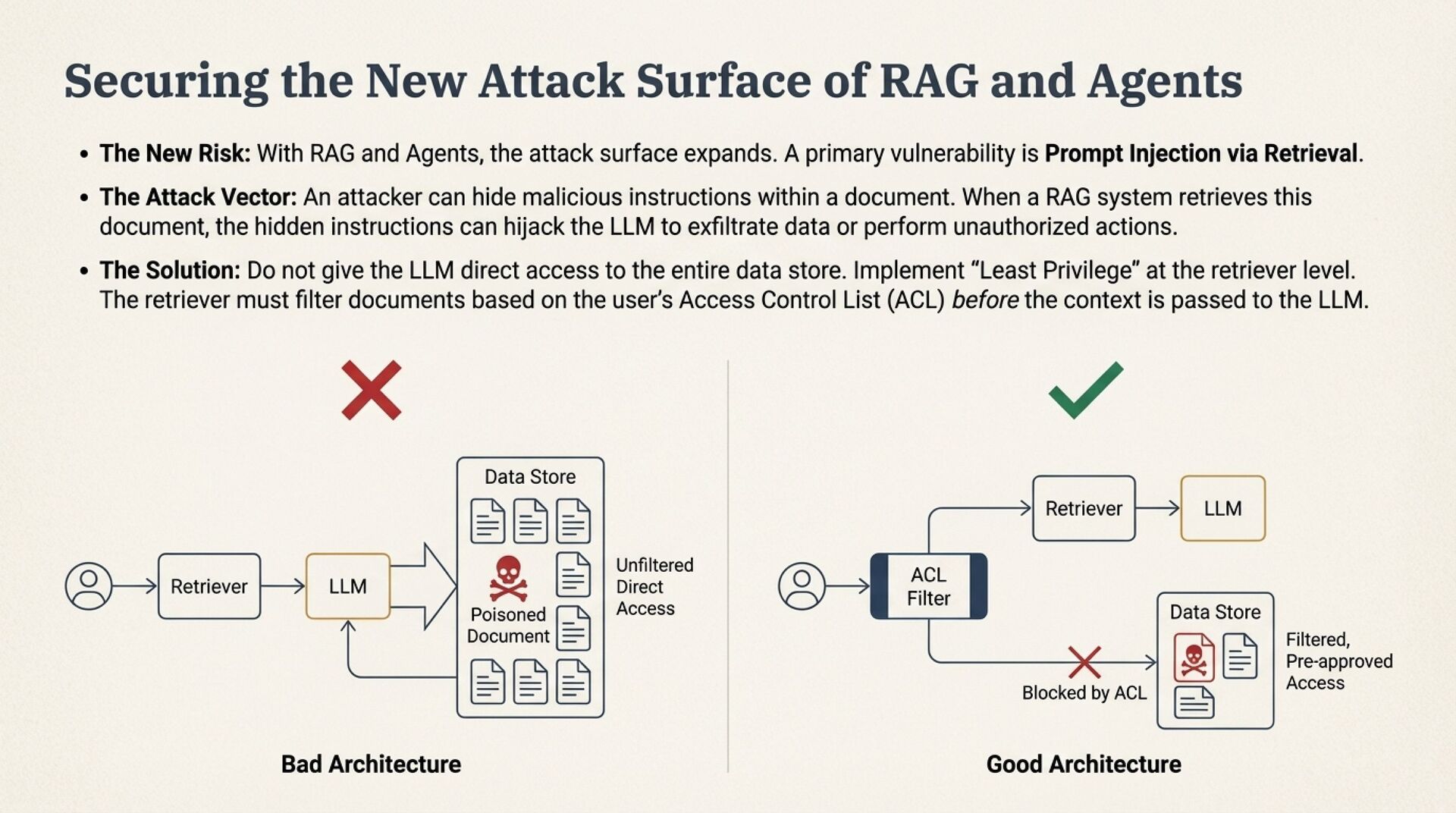 • RAG and agents expand the attack surface, prompt injection and tool abuse require least privilege, ACL filtering before retrieval, and governance as code.