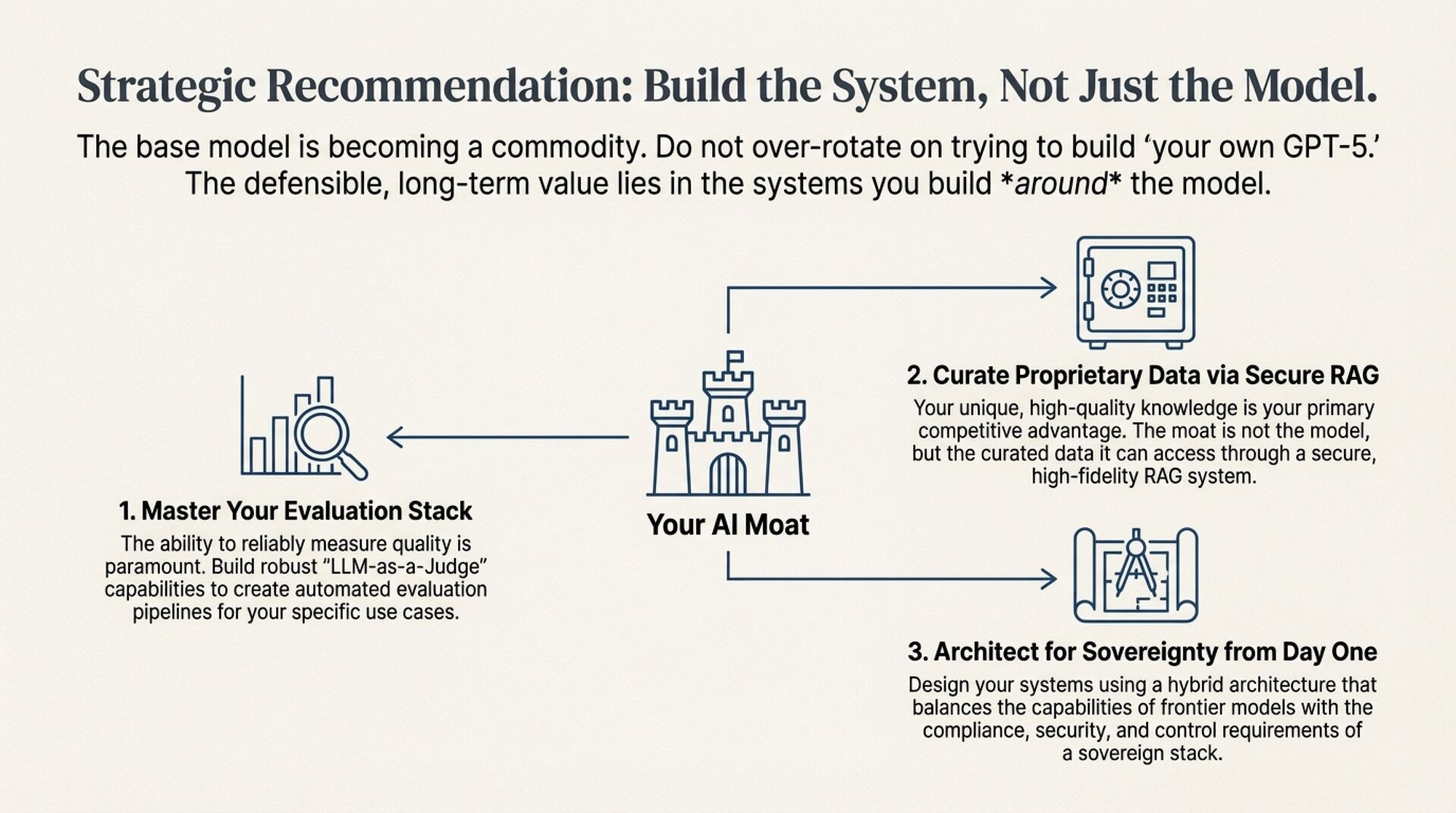 The executive takeaway is sharp. Do not over-invest in building “your own GPT-5.” Treat base models as commodities. Win through evaluation stacks, proprietary data curation, secure RAG, measurable quality, and enforceable policy controls.