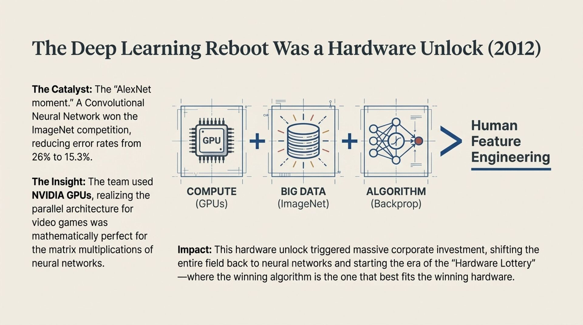 • The deep learning reboot (2012) was a hardware unlock, GPUs made large-scale neural training practical, validating “compute + data + backprop” over manual feature engineering.