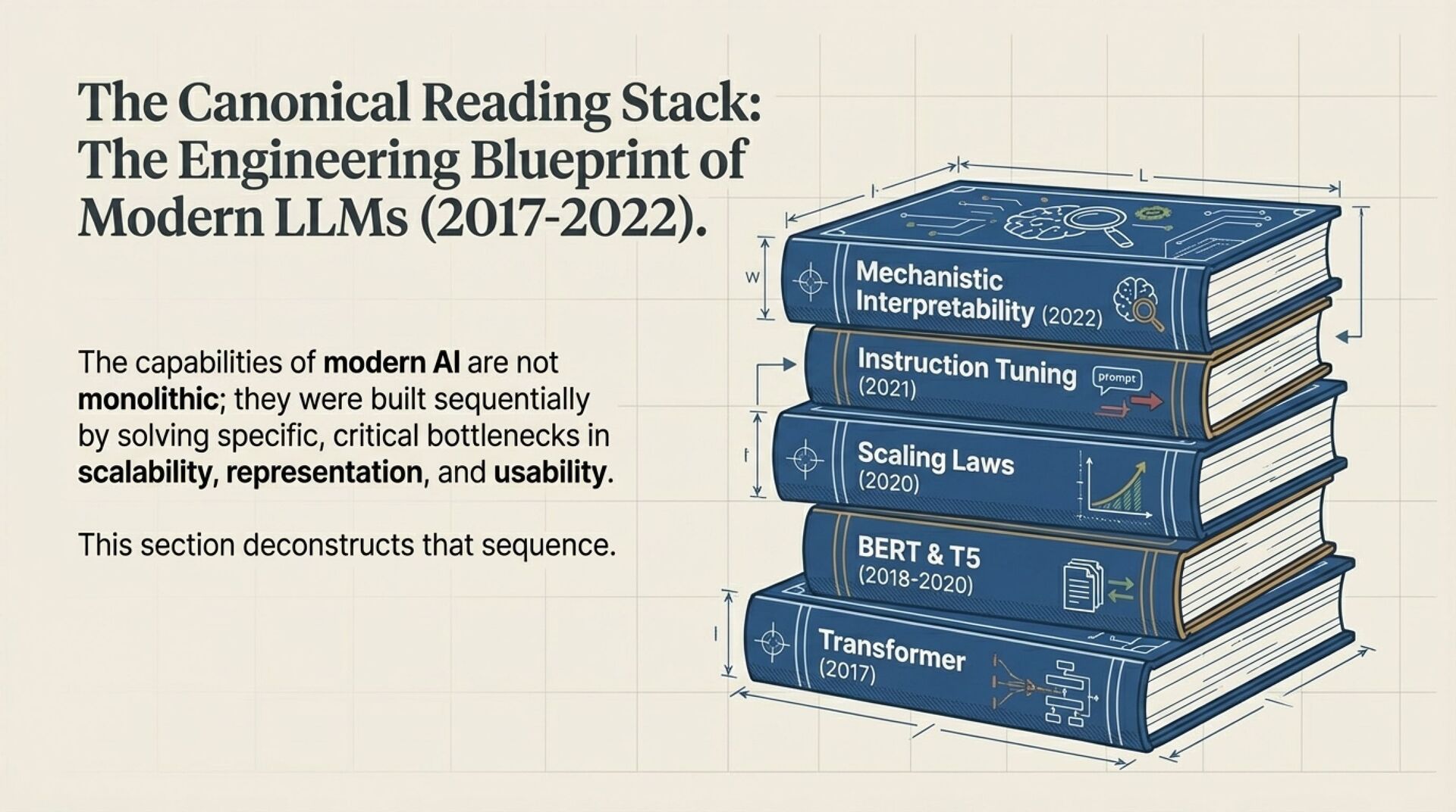 It then builds a canonical “Reading Stack” (2017–2025) as a practical blueprint for modern LLM engineering: