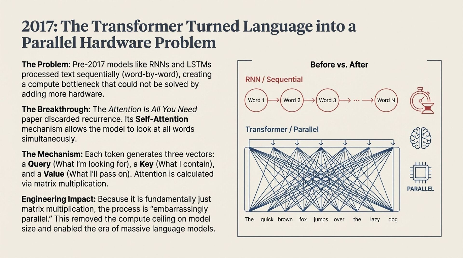 • Transformers (2017) became dominant because self-attention reduces language modeling to highly parallel matrix operations, perfectly aligned with GPU architectures and memory bandwidth.