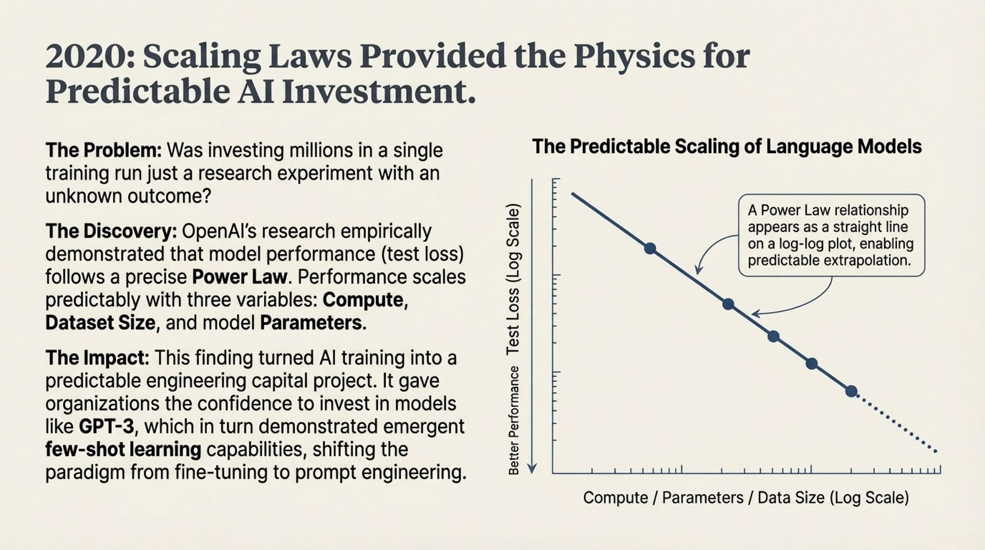 • Scaling laws and GPT-3, predictable scaling turns training into an engineering capital project, prompting replaces widespread fine-tuning.
