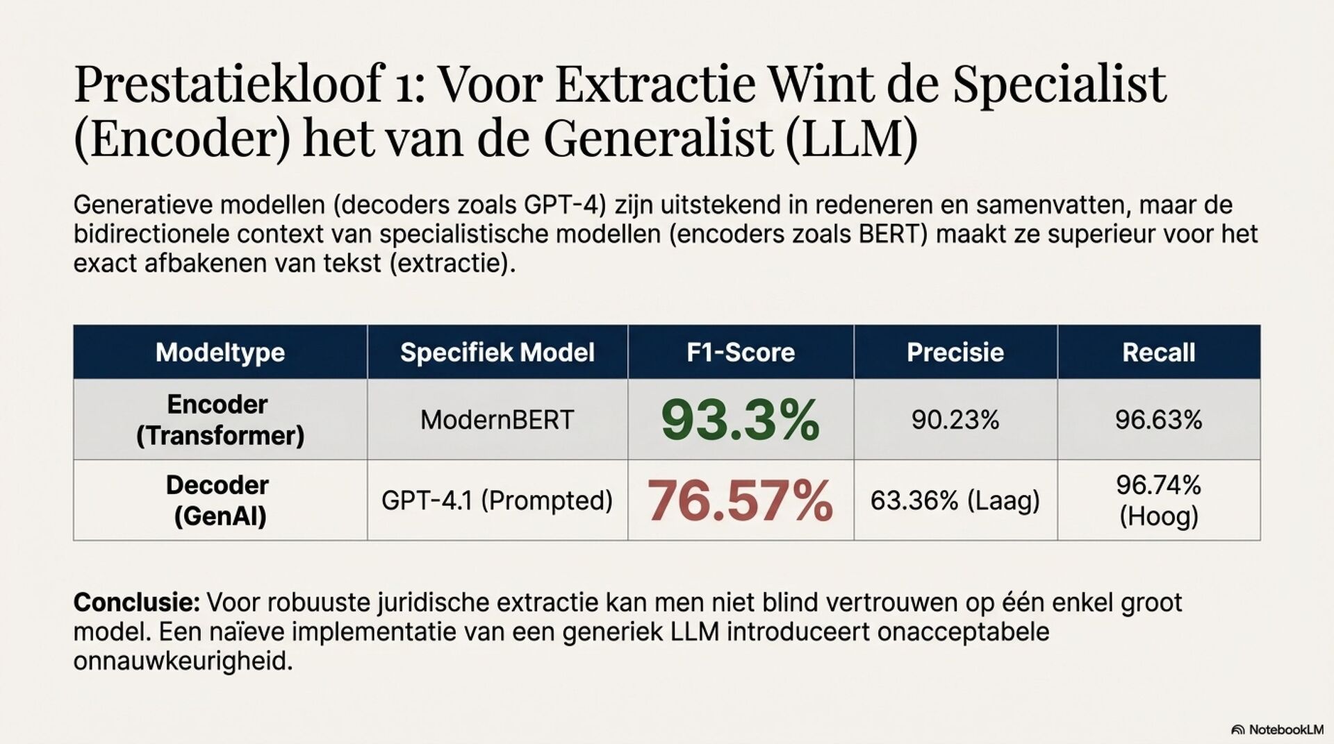 Het rapport laat met empirische evaluaties zien dat generatieve LLM’s zoals Gemini en GPT-varianten indrukwekkend redeneren, maar minder geschikt zijn voor precieze span-taken zoals citatie-extractie. Specialized encoder-modellen, bijvoorbeeld ModernBERT en LEGAL-BERT, blijven hier duidelijk beter. Bovendien dalen LLM-prestaties sterk buiten het Engels. Dat creëert risico op ongelijkheid tussen EU-talen en maakt “één validatie, overal uitrollen” onhoudbaar.
