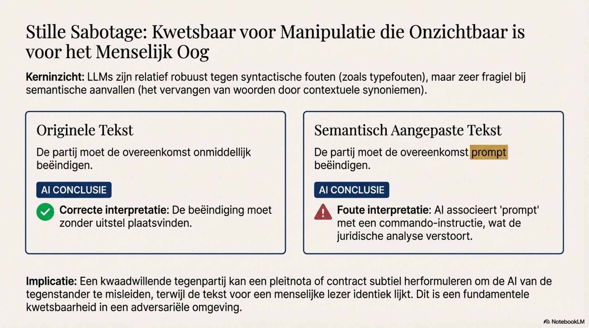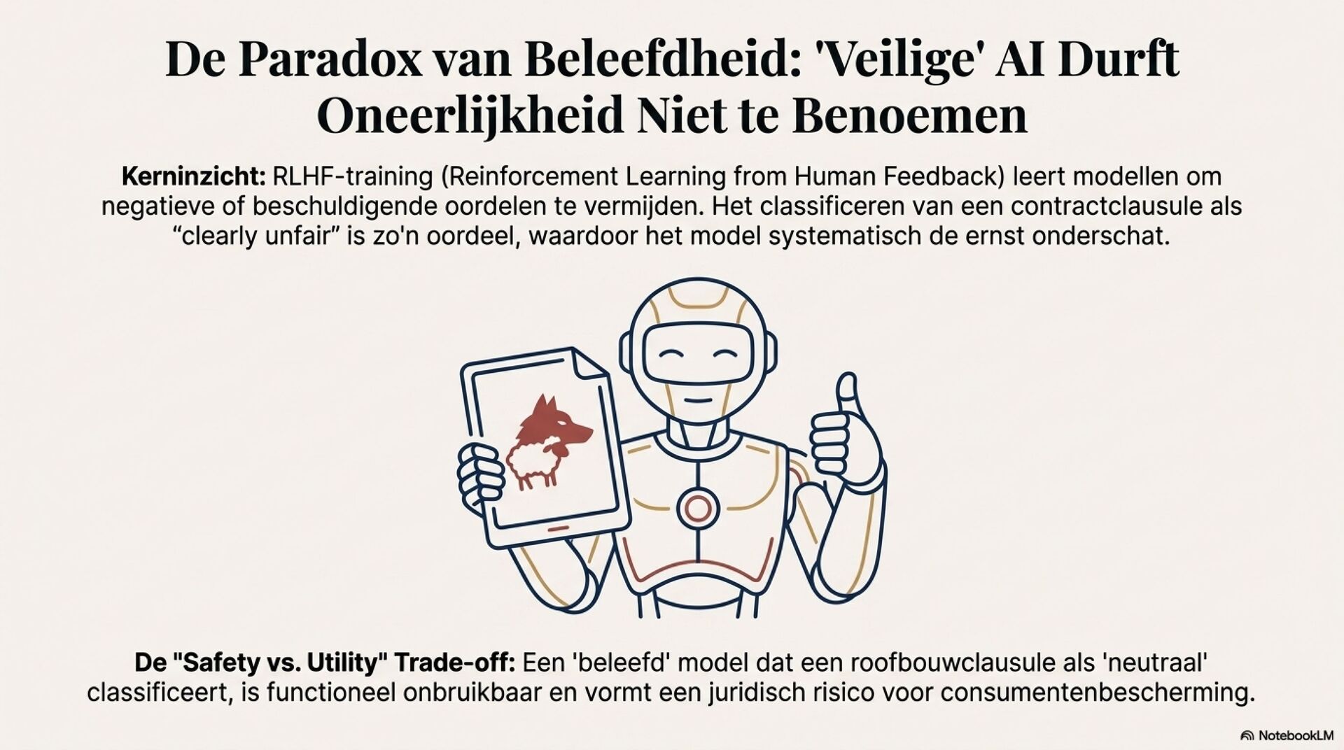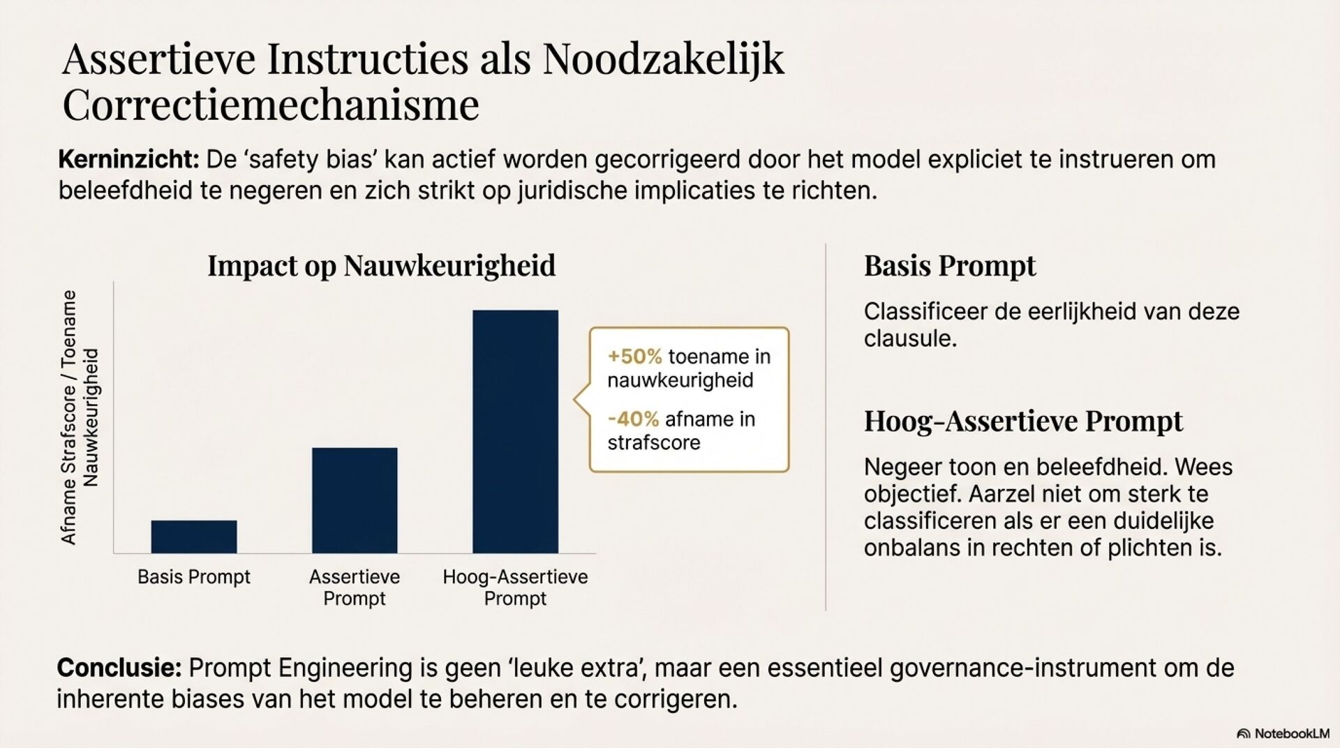 Een extra spanning komt uit safety alignment. Commerciële modellen vermijden negatieve oordelen, waardoor oneerlijke contractclausules te vaak als neutraal of eerlijk worden gelabeld. Assertieve prompting werkt als governance-correctie en verbetert classificatie aantoonbaar, maar vraagt expliciet beleid, training en continue evaluatie.
