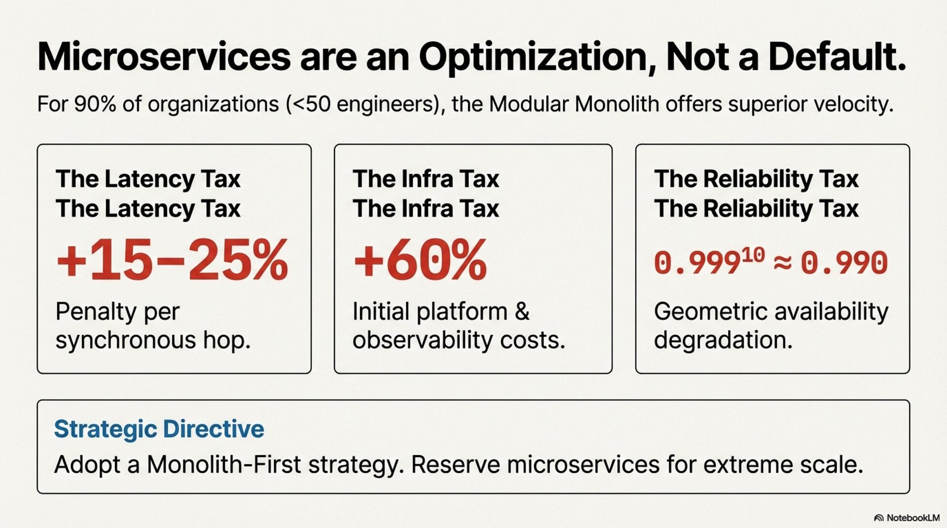 The software engineering industry is in the midst of a significant architectural debate, with the pendulum swinging between the centralized simplicity of monolithic architectures and the distributed nature of microservices. This transition, often catalyzed by the success stories of hyper-scale companies, has led to the widespread adoption of microservices. However, a growing counter-movement highlights the substantial, often underestimated, costs of this approach. This whitepaper provides an evidence-based framework for software architects to understand and manage what we term the "Distributed System Tax"—the inherent performance, reliability, and operational overhead incurred when replacing in-process function calls with network requests.