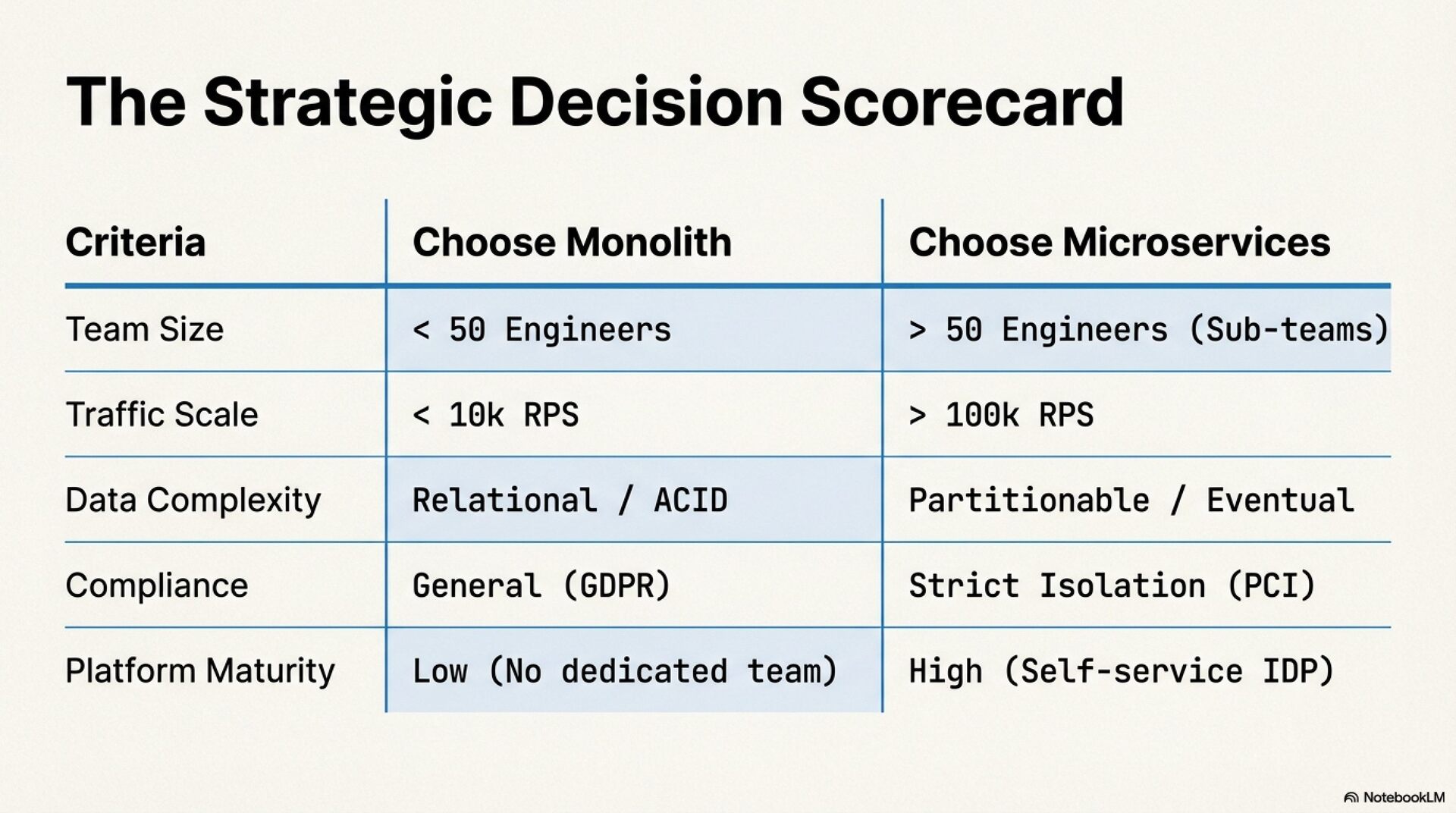 • Monolith: A single deployable unit where all business logic shares the same process memory and typically a centralized relational database.