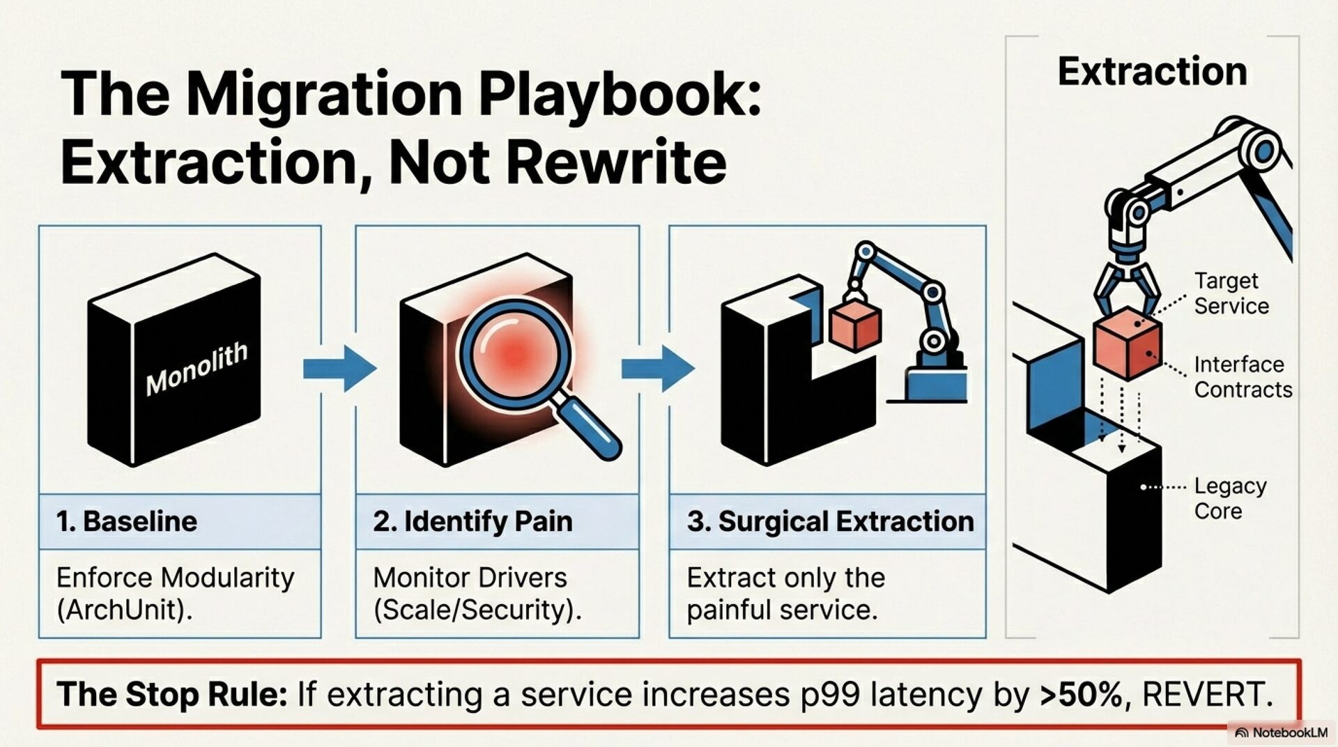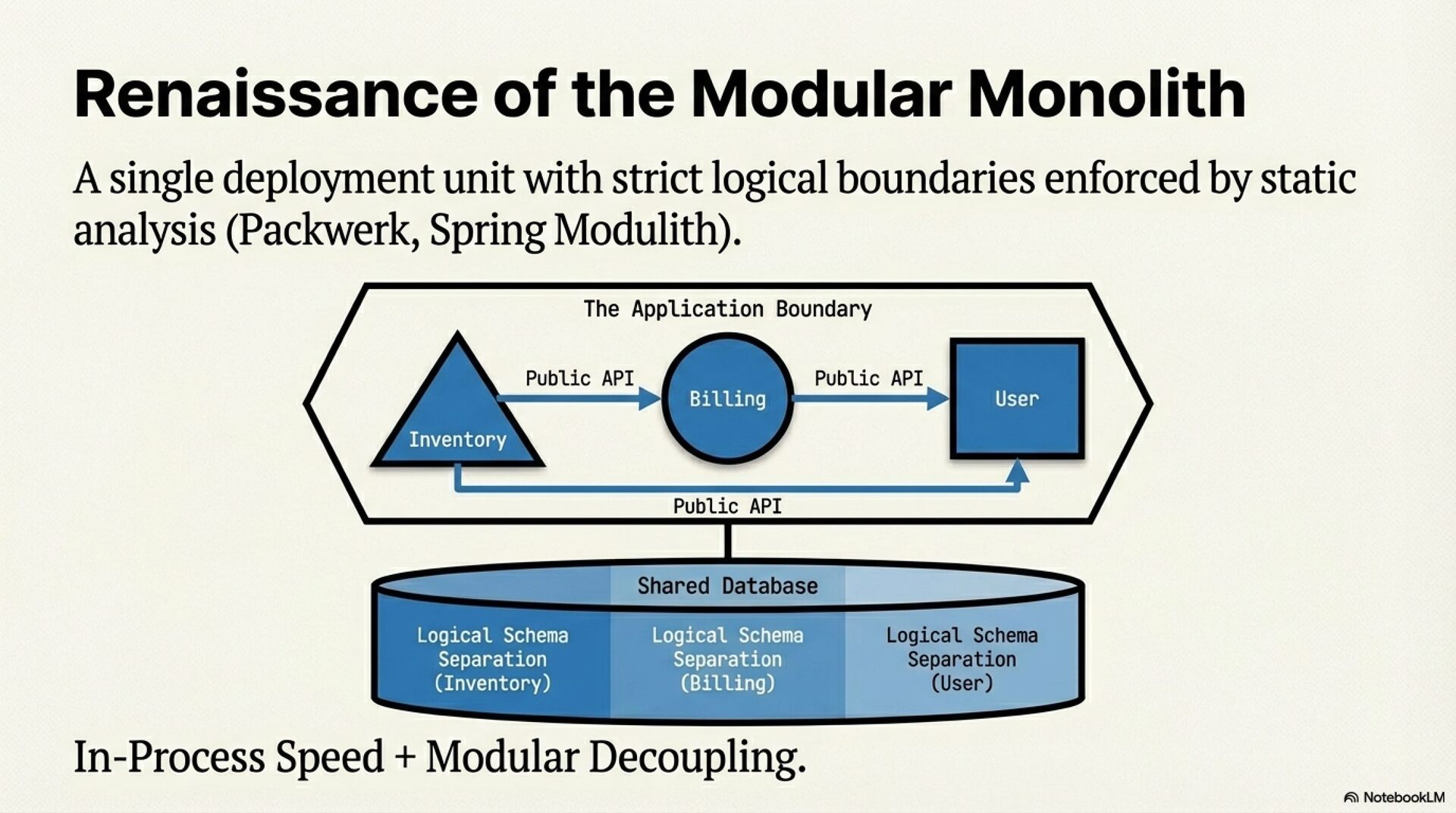 • Modular Monolith: A deployment monolith where code is strictly organized into domain modules with enforced boundaries (e.g., via static analysis tools like ArchUnit or Packwerk), prohibiting arbitrary coupling.