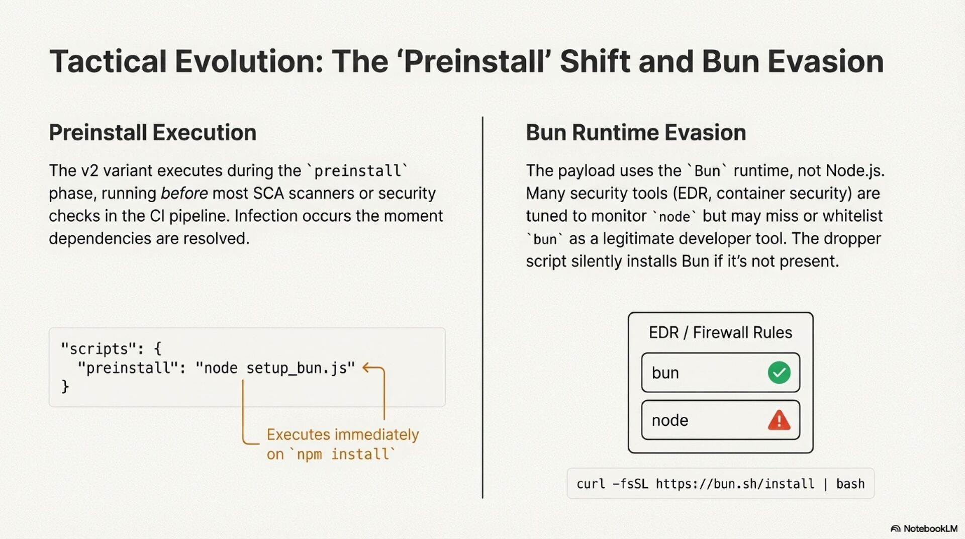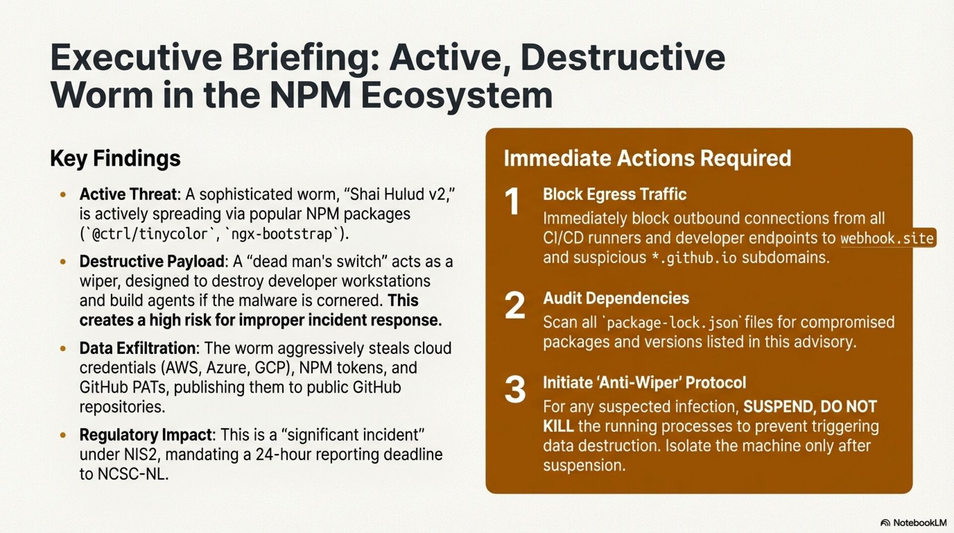 This presentation analyzes the Shai Hulud malware campaign, a self replicating NPM supply chain worm that targets JavaScript and TypeScript ecosystems and directly threatens CI/CD pipelines in the Dutch public sector, including the Judiciary. The second wave of the attack, active since late November 2025, moves execution to the preinstall phase and uses the Bun runtime to evade traditional controls, which means systems are compromised as soon as dependencies are resolved, before builds, tests, or scanners run.