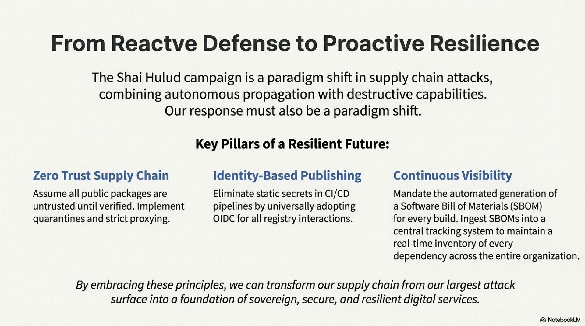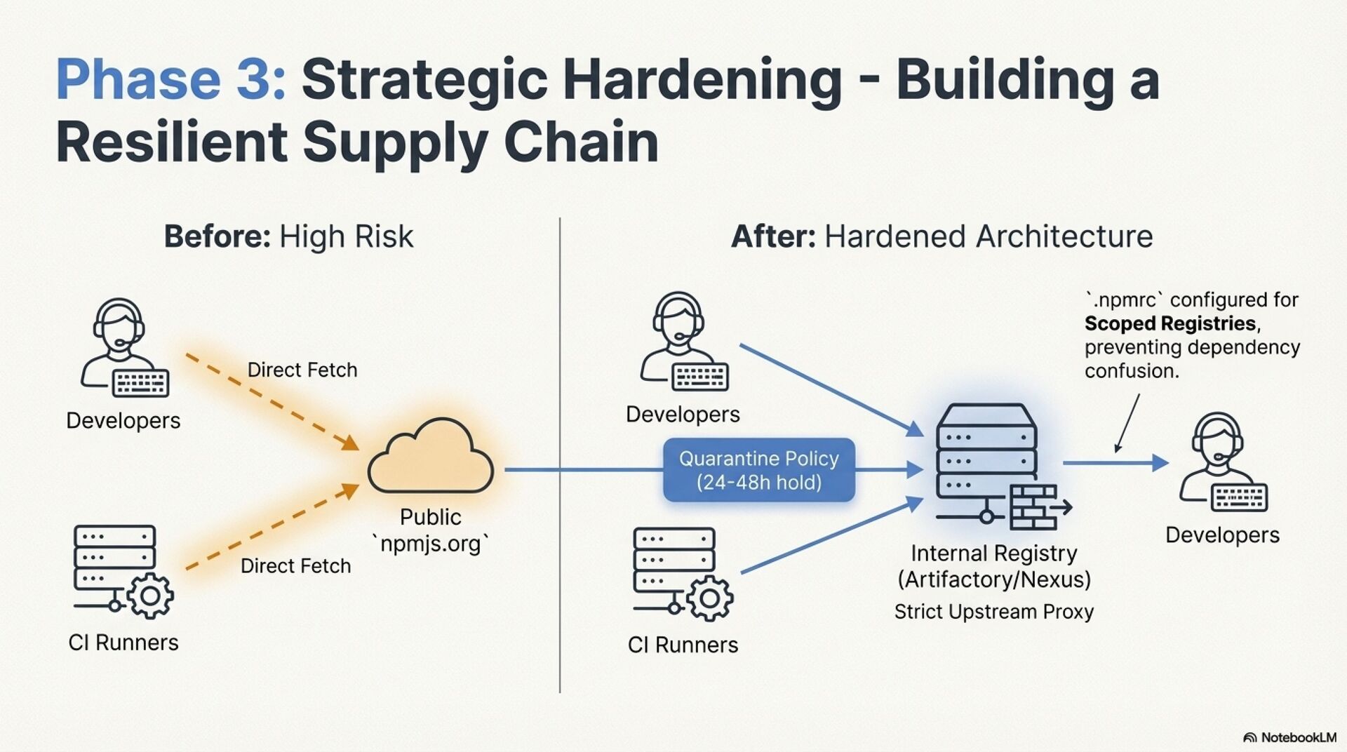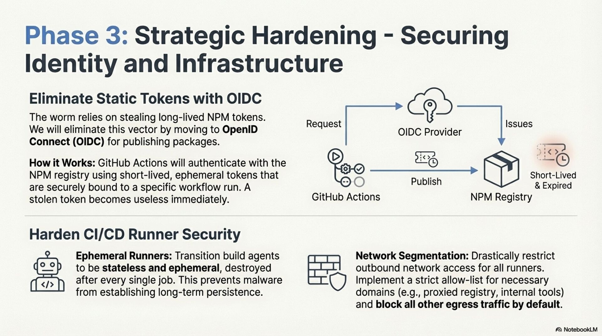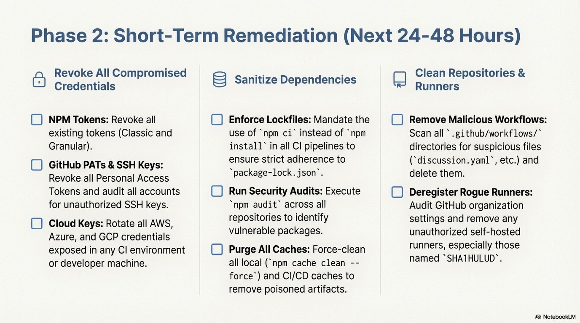 The advisory proposes a phased response. Immediate containment focuses on an anti wiper protocol that suspends suspicious processes instead of simply disconnecting machines, followed by reimaging from known good images and aggressive credential rotation. Short term remediation enforces dependency pinning, npm ci, registry cleanup, and removal of rogue runners and workflows. Strategic hardening introduces strict egress controls, quarantined private registries, OIDC based publishing to eliminate long lived NPM tokens, ephemeral CI runners, network segmentation, and SBOM driven supply chain observability. Together, these measures move the organization from reactive patching to a resilient, sovereignty aware supply chain defense.