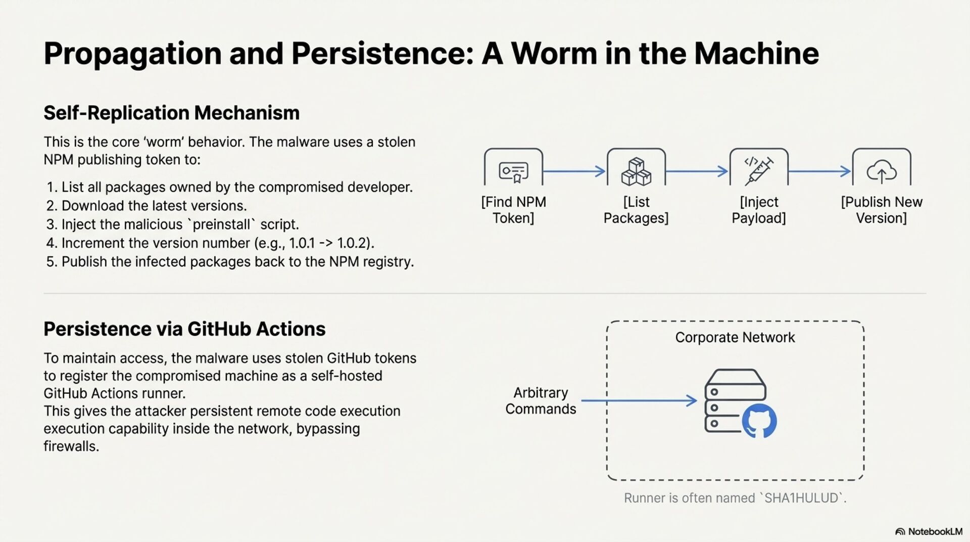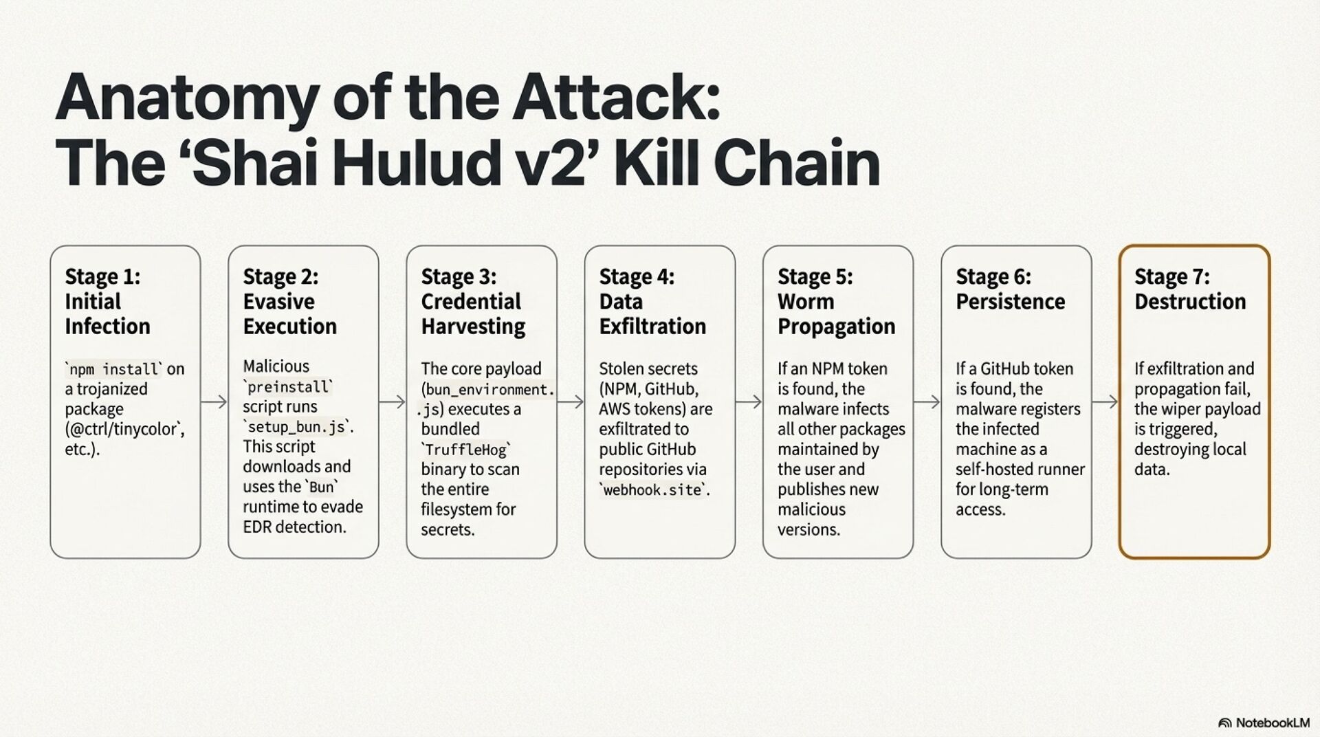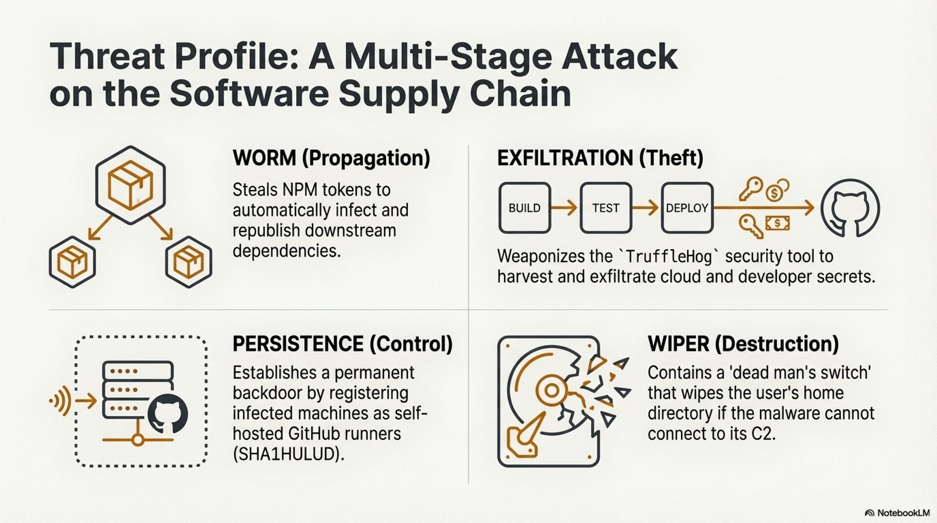 Shai Hulud combines credential theft, worm like propagation, and a destructive wiper. The malware abuses a dropper script, setup_bun.js, which silently installs Bun and launches a large obfuscated payload, bun_environment.js. This payload weaponizes the TruffleHog security tool to harvest cloud keys, GitHub tokens, and NPM credentials, then uses stolen NPM tokens to republish trojanized packages and infect the wider ecosystem. At the same time, it registers infected machines as GitHub Actions self hosted runners, creating persistent remote execution footholds inside internal networks.