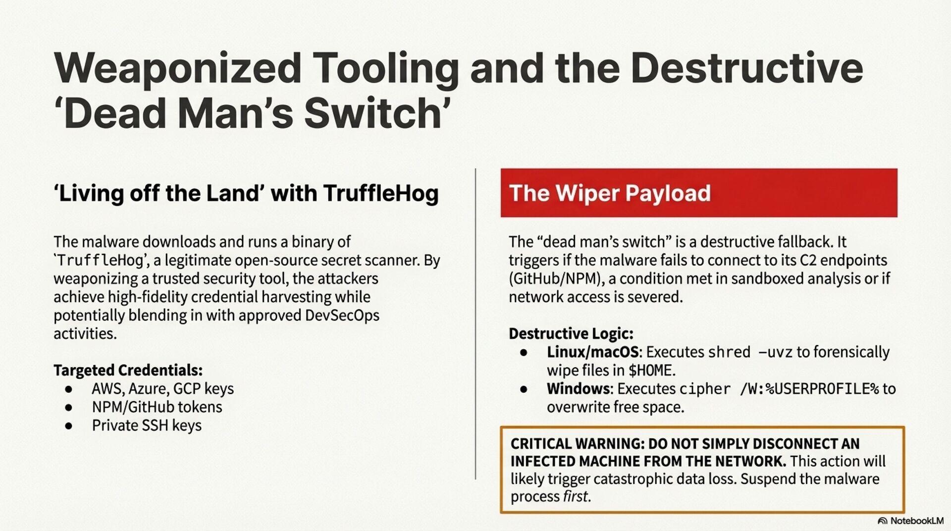A critical feature is the “dead man’s switch” wiper. When the malware can no longer reach GitHub or NPM and cannot propagate, it attempts to shred the user’s home directory on Linux and macOS or wipe the user profile on Windows. This turns a supply chain compromise into a potential sabotage event, with severe consequences for developer workstations, build agents, and release pipelines.