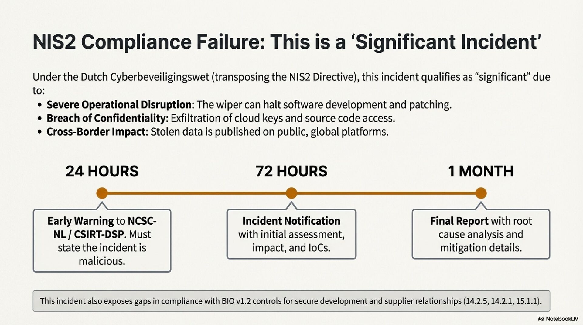 For the Dutch Judiciary and broader public sector, the risk profile is classified as critical. Exfiltrated secrets can expose cloud environments, private repositories, infrastructure as code, and internal package registries, which in turn enables lateral movement and internal worm propagation. Any successful infection is likely to qualify as a significant incident under NIS2 and triggers strict reporting obligations, as well as scrutiny against BIO v1.2 controls for secure development and supplier relationships.
