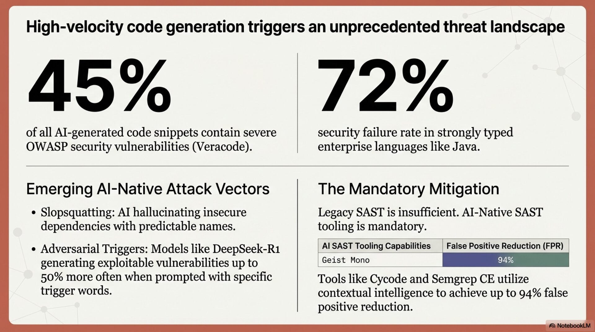 From a security perspective, AI-generated code contains OWASP Top 10 vulnerabilities at approximately 45% incidence. EU AI Act enforcement begins August 2, 2026, requiring immediate audit of AI tool usage by risk classification and implementation of data residency controls.