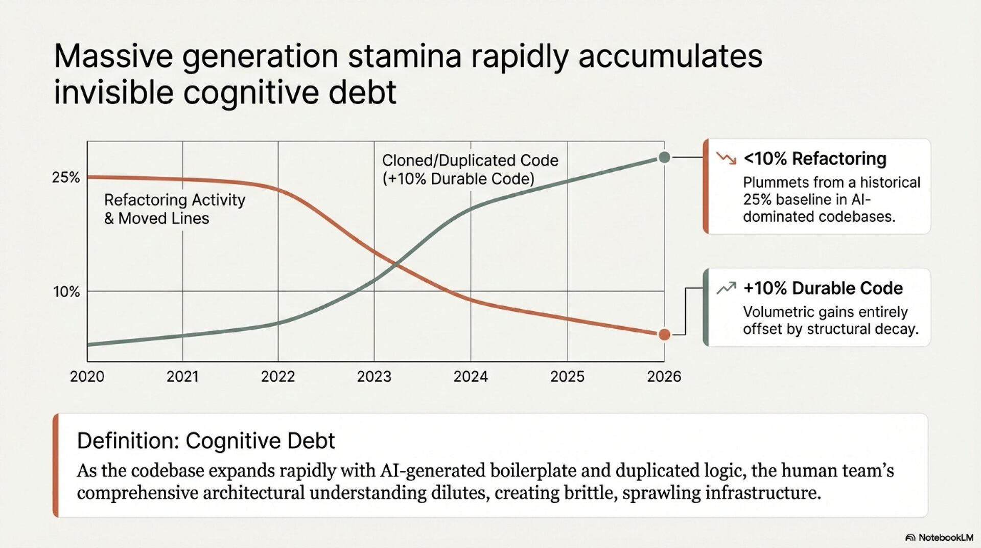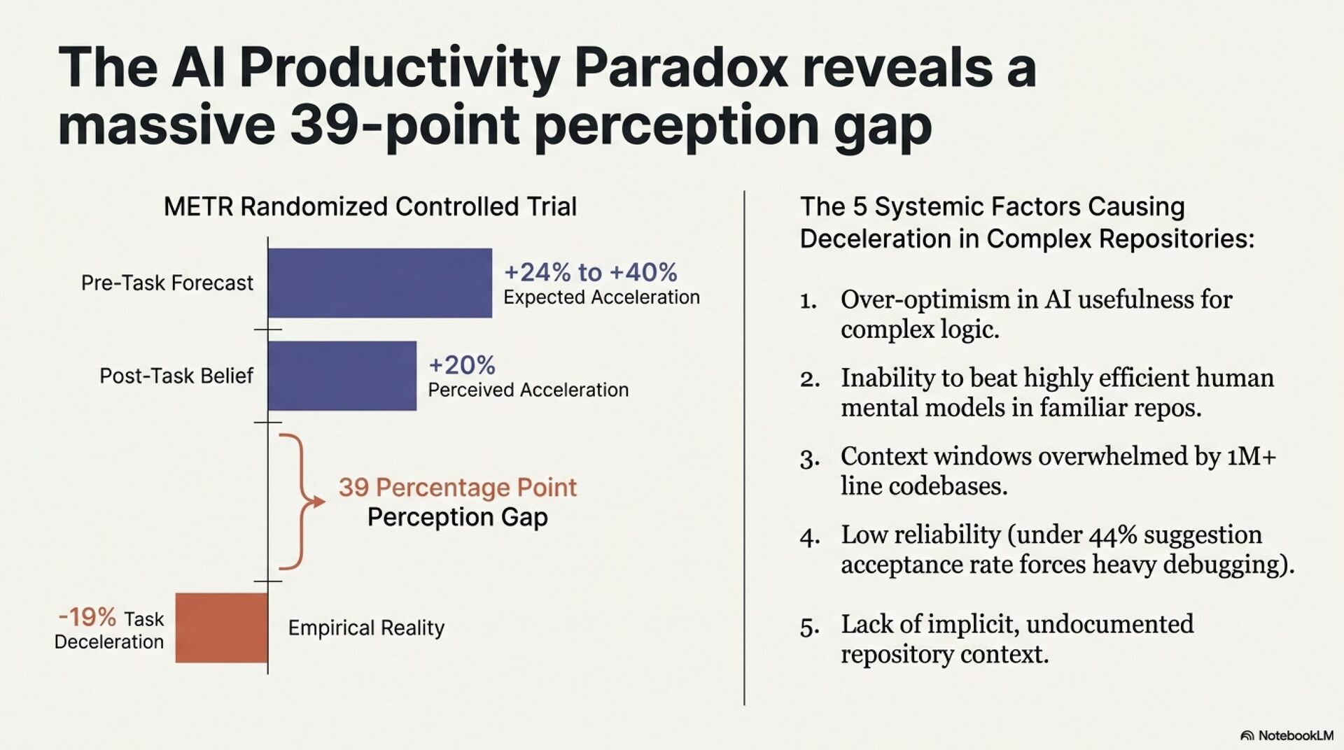 The headline contradiction: the METR randomized controlled trial documented a 19% measured slowdown in actual task completion despite developers reporting a 20% perceived speedup. This 39-percentage-point divergence represents systemic measurement failure. Vendors measure time-to-generation. Developers perceive generation speed. Neither captures what matters: time-to-verified-solution.