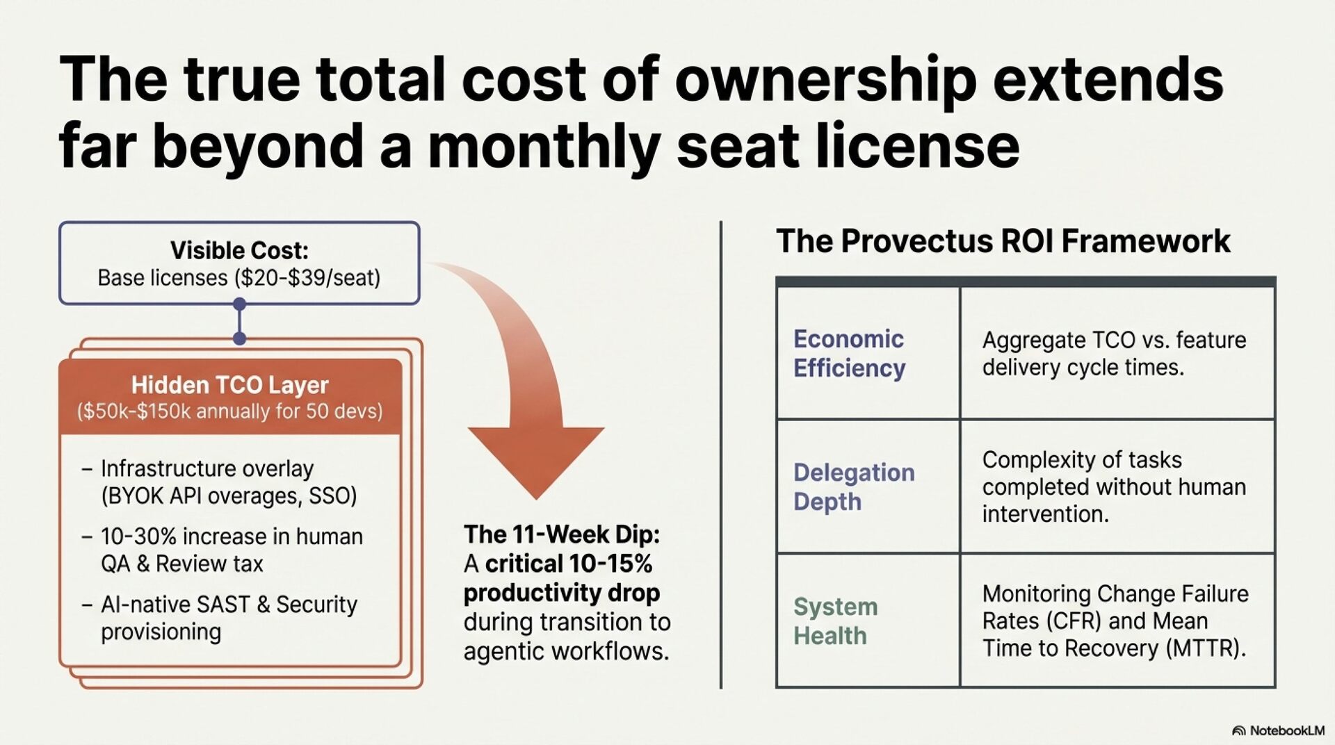 Enterprise case studies confirm both the opportunity and its limits. Klarna achieved 40% coding acceleration but only 8% improvement in product release velocity, confirming that coding was never the primary constraint. True total cost of ownership for a 50-developer team runs to approximately 292,000 USD annually, with vendor licensing representing only 7%. Integration, governance, and infrastructure constitute the remaining 93%.
