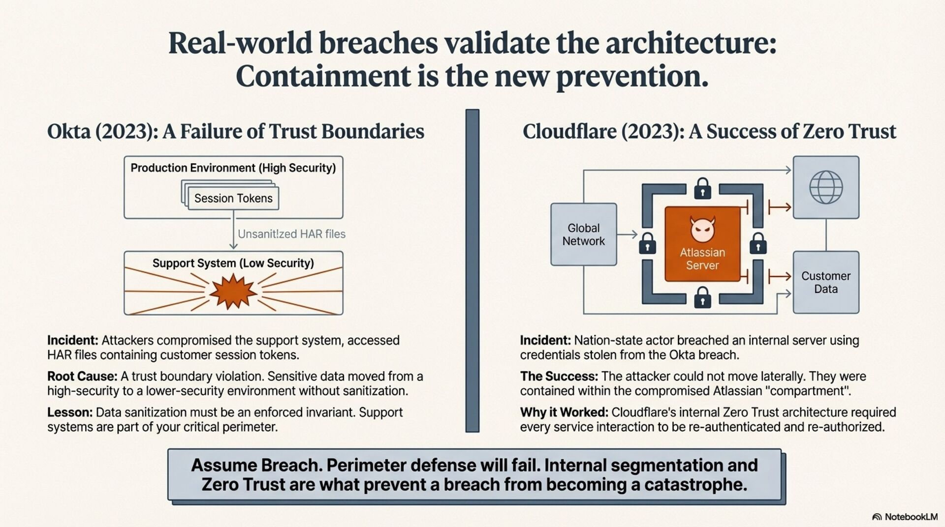 The "Castle and Moat" model of a single, hardened network perimeter is definitively obsolete. In a modern landscape of microservices and AI agents, trust boundaries are fractal; they exist not just at the network edge but between every service, database, and API call. The "Zero Trust" model demands a shift to identity-centric security, where every interaction is authenticated and authorized based on a verifiable identity, not network location. This granular understanding of trust boundaries is critical for preventing lateral movement and containing the inevitable breach.