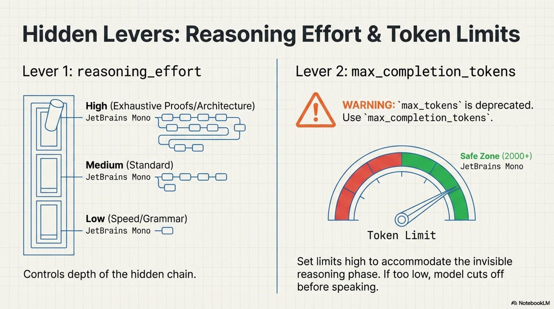 • Budget for hidden reasoning with max_completion_tokens, leave headroom