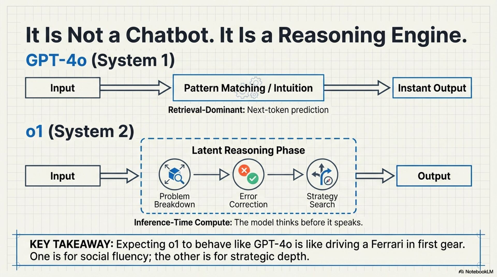 o1 is optimized to “think first, answer later” using internal reasoning tokens you do not see. That improves accuracy on hard problems, but it changes the experience:
