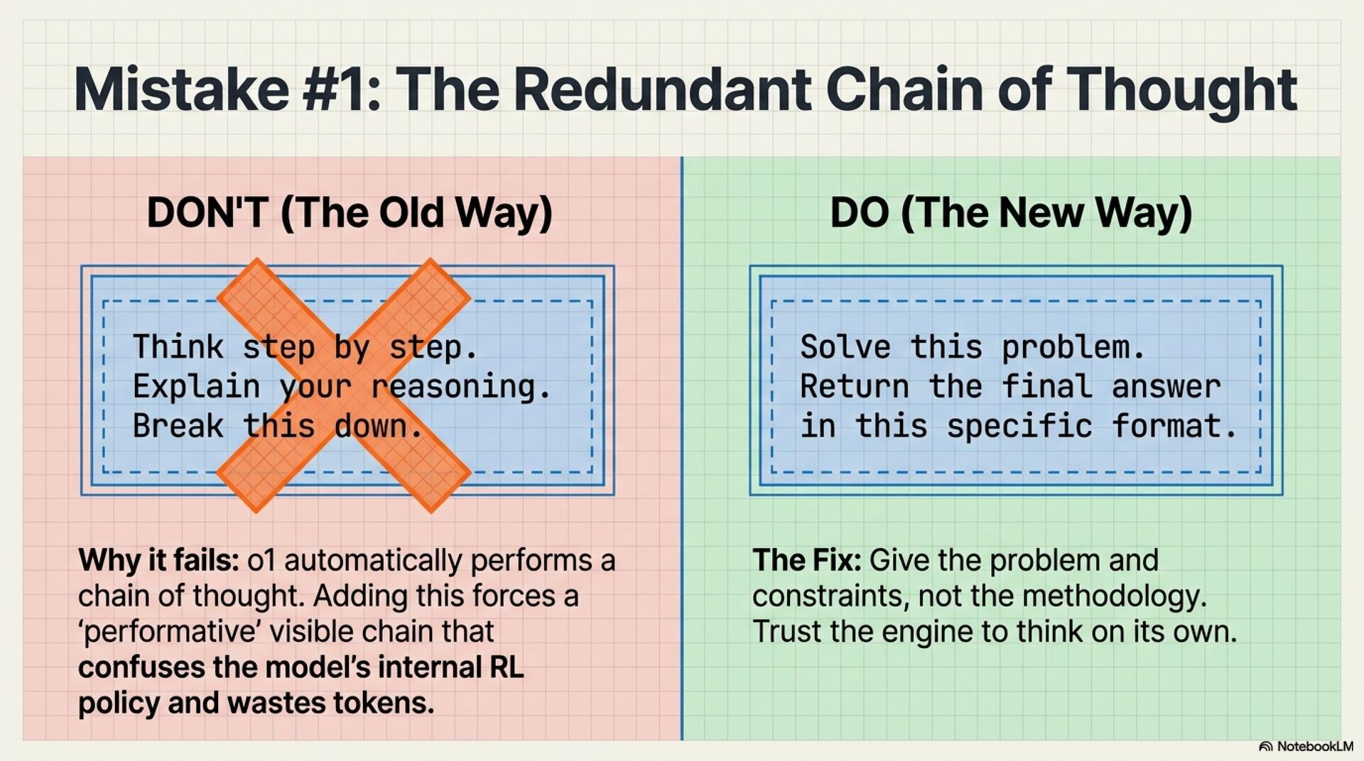 Old best practices assumed pattern matching models needed help “thinking”. o1 already reasons by default. Legacy techniques often add waste, increase latency, and reduce instruction fidelity.