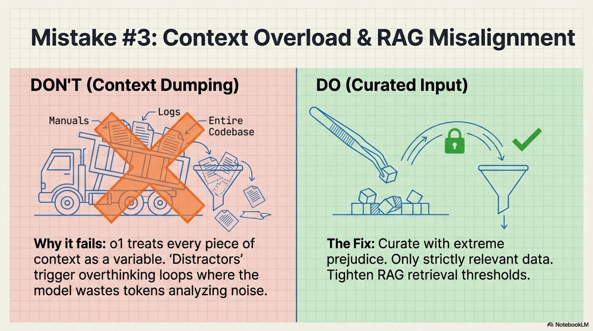 Dumping large, noisy context makes o1 reason over distractors. Costs spike, instruction following drops. Fix with strict retrieval, smaller chunks, tighter thresholds, clear delimiters.