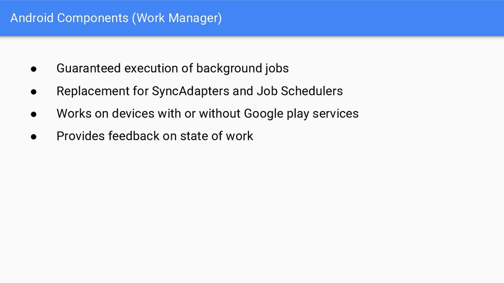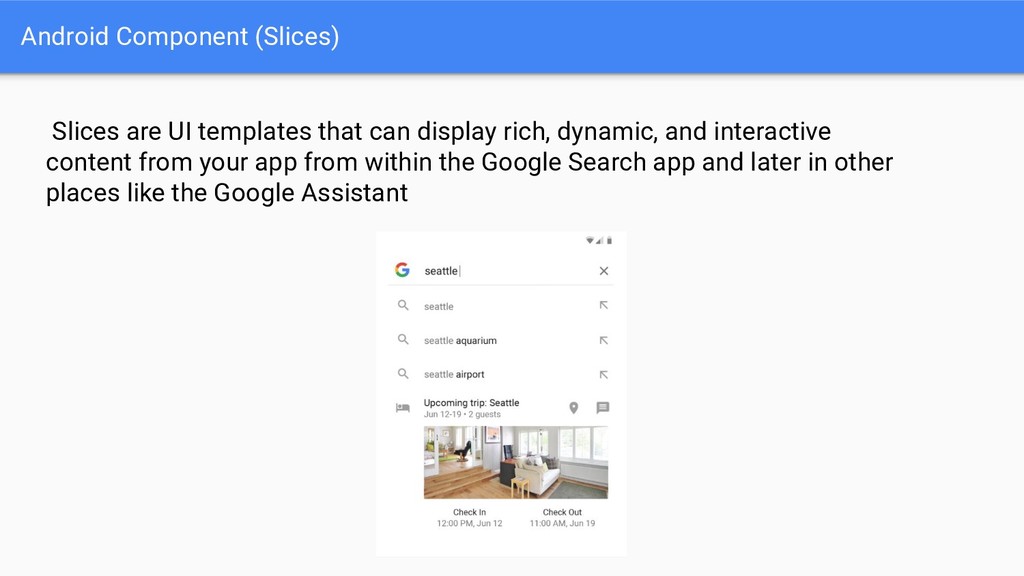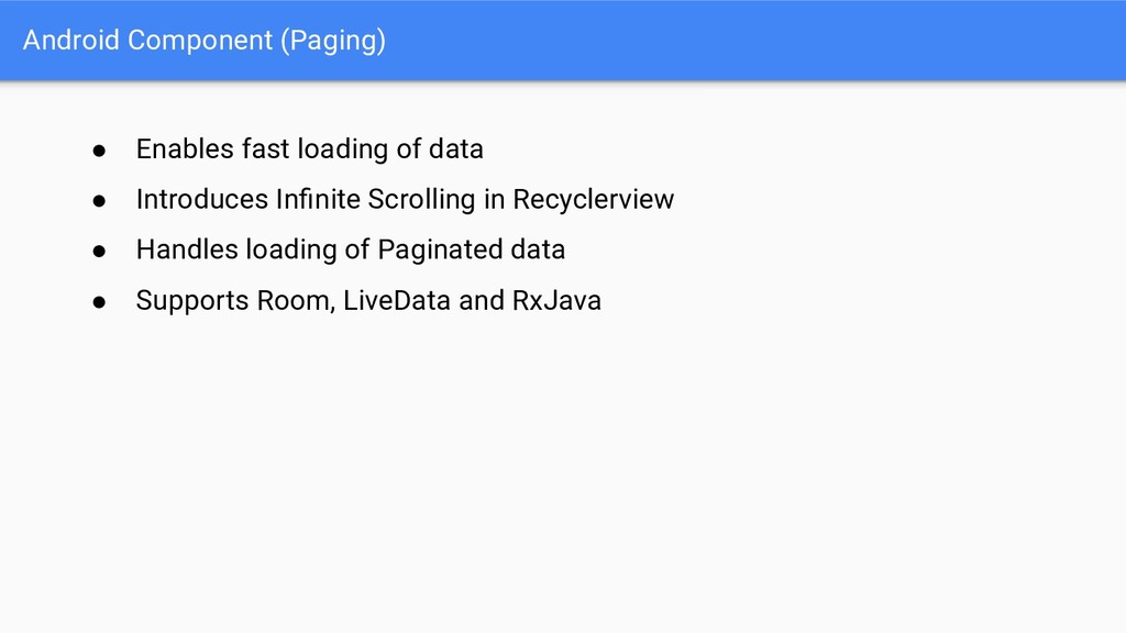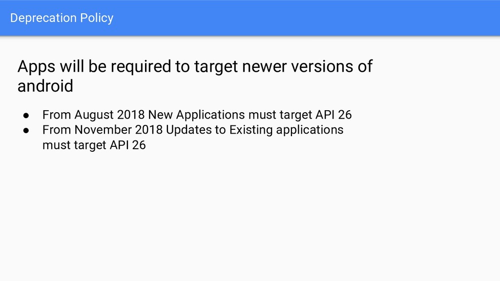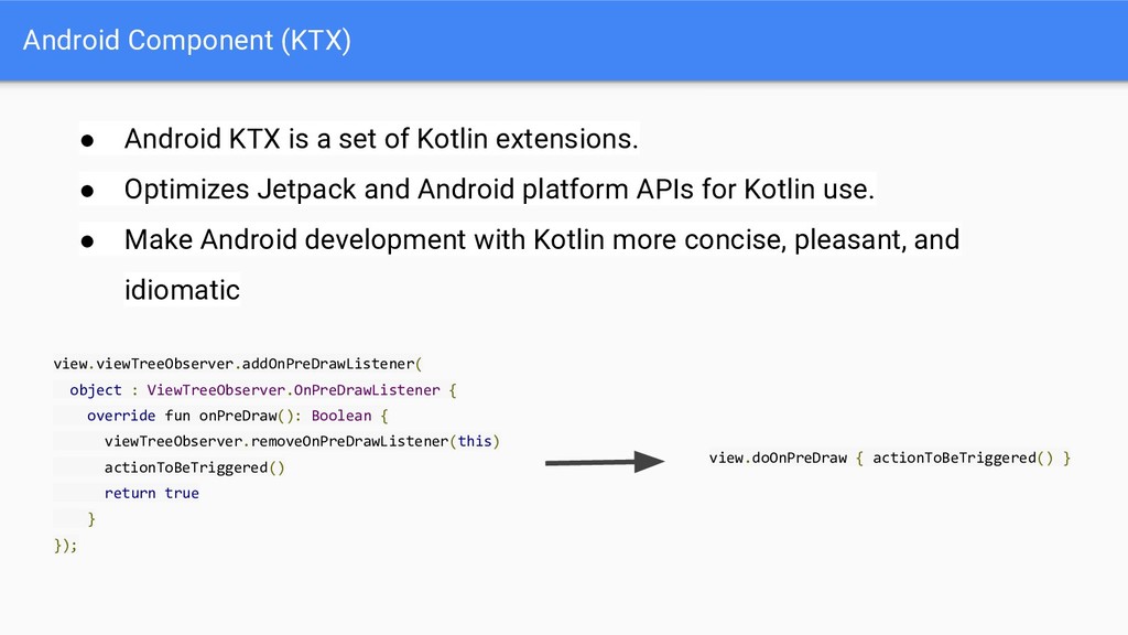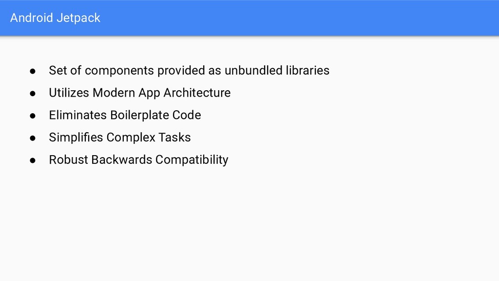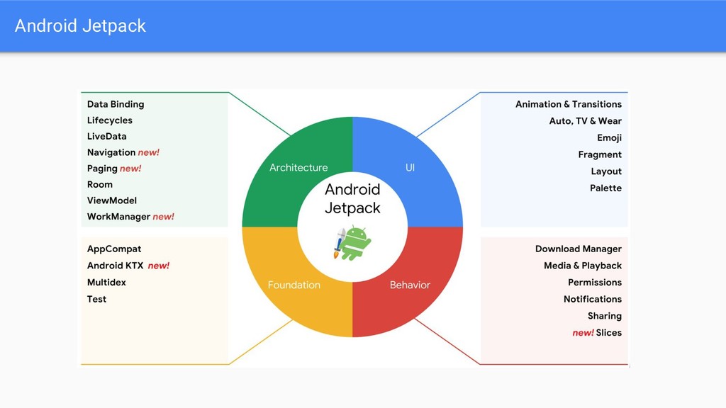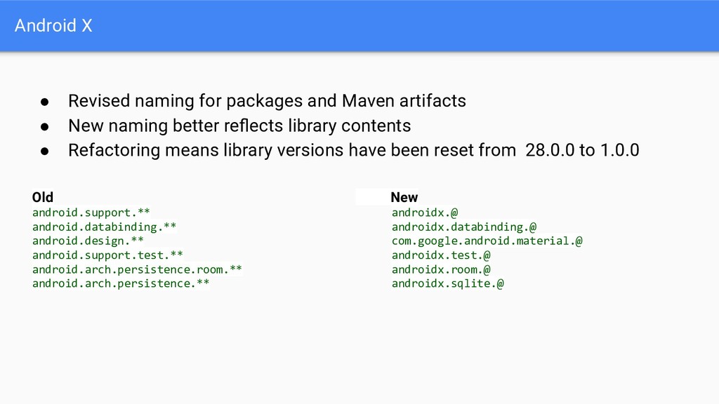 • New naming better reflects library contents • Refactoring means library versions have been reset from 28.0.0 to 1.0.0 Old New android.support.** androidx.@ android.databinding.** androidx.databinding.@ android.design.** com.google.android.material.@ android.support.test.** androidx.test.@ android.arch.persistence.room.** androidx.room.@ android.arch.persistence.** androidx.sqlite.@
