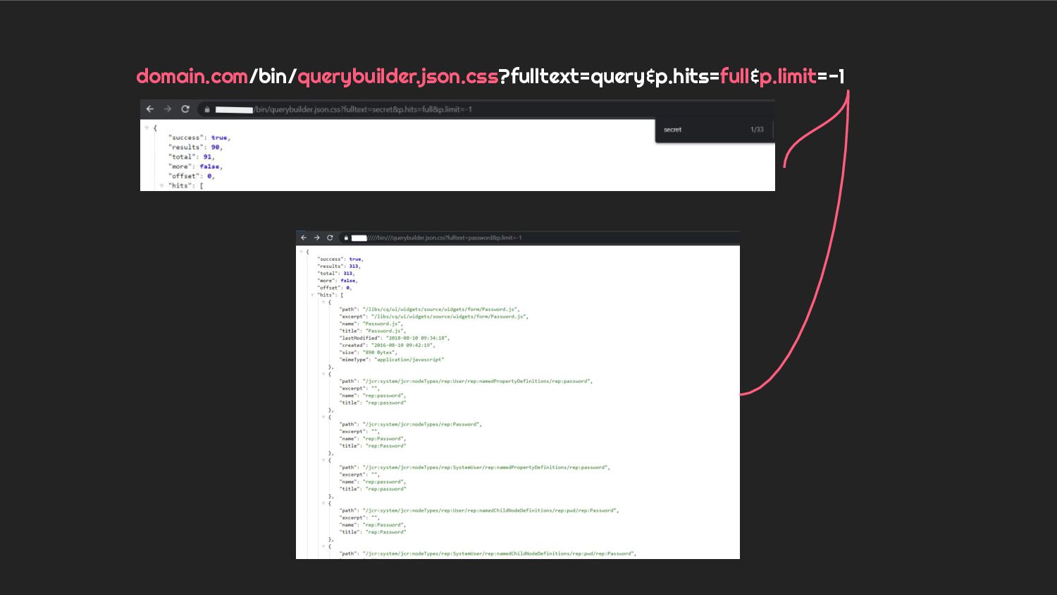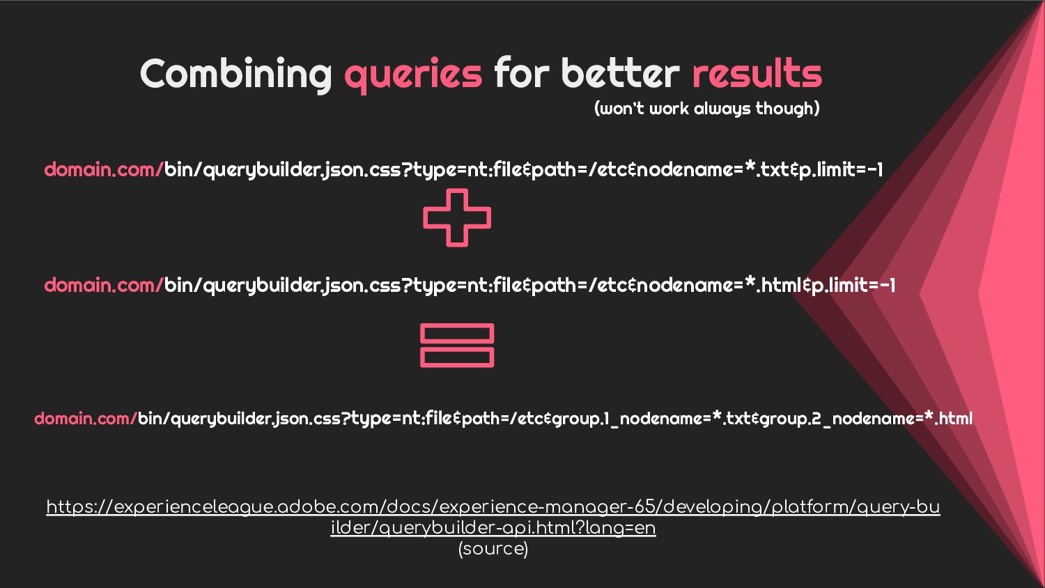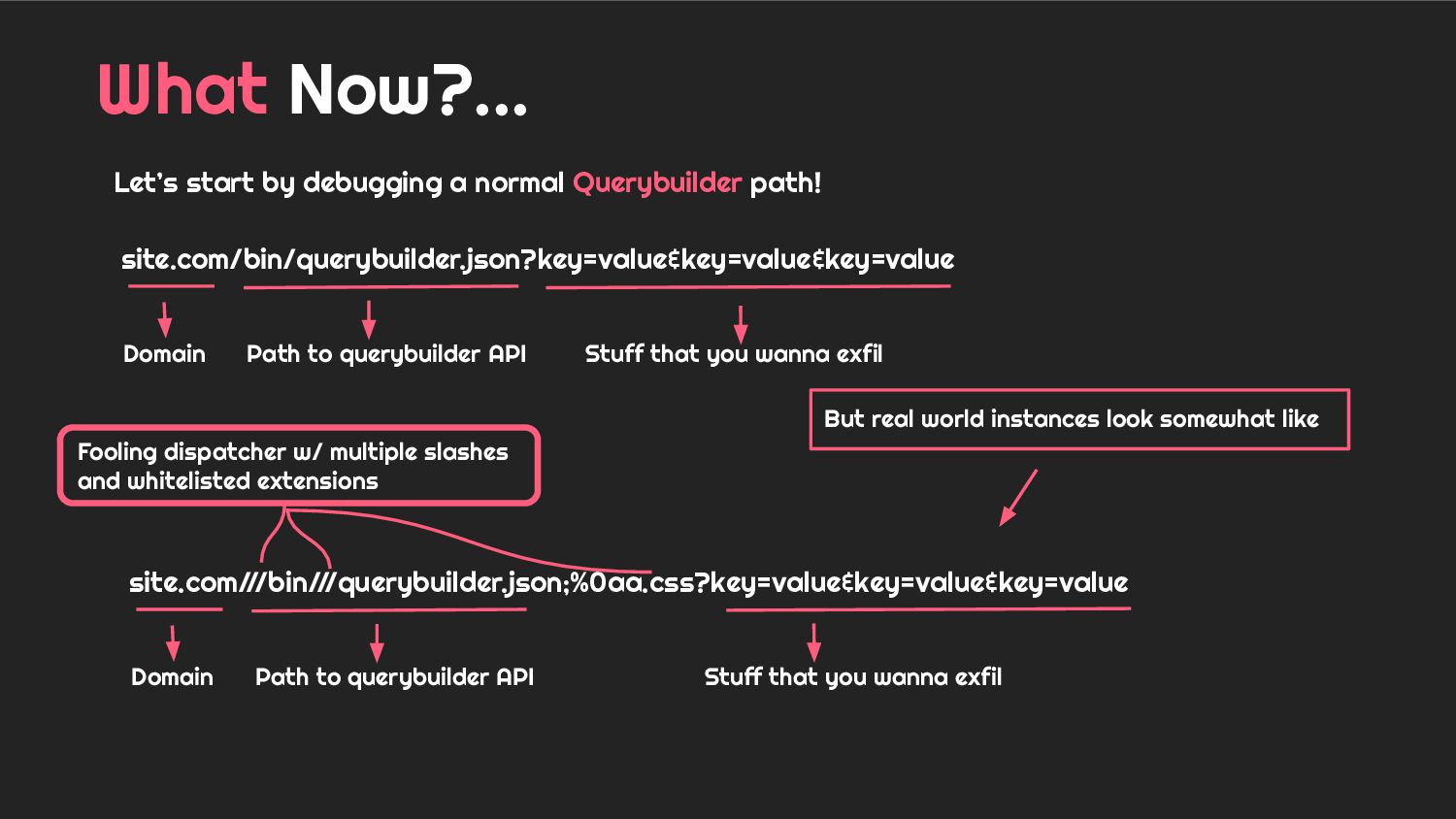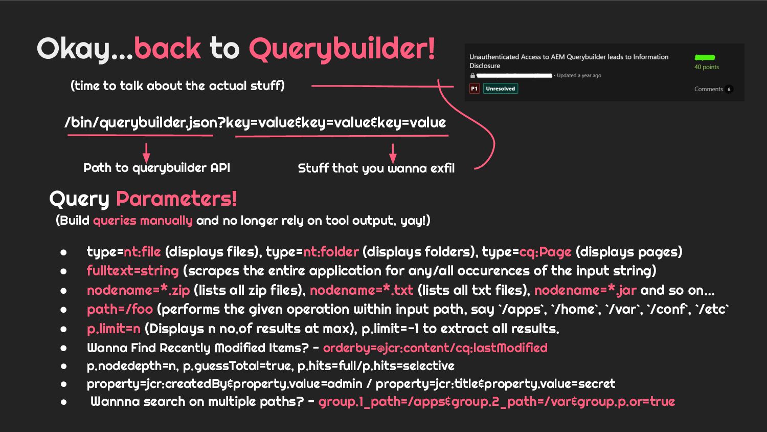 - Case 3: Holistic overview of AEM Querybuilder API and ways to pwn it.