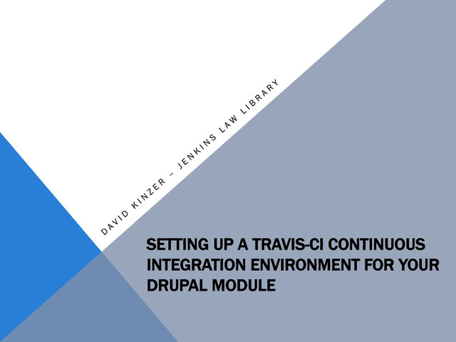 This session will focus on the use and benefits of a continous integration environment. We will walk through how to set up a continuous integration environment for a Drupal project using the hosted service called Travis-CI.