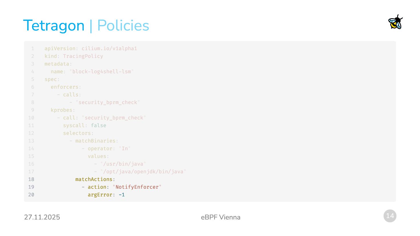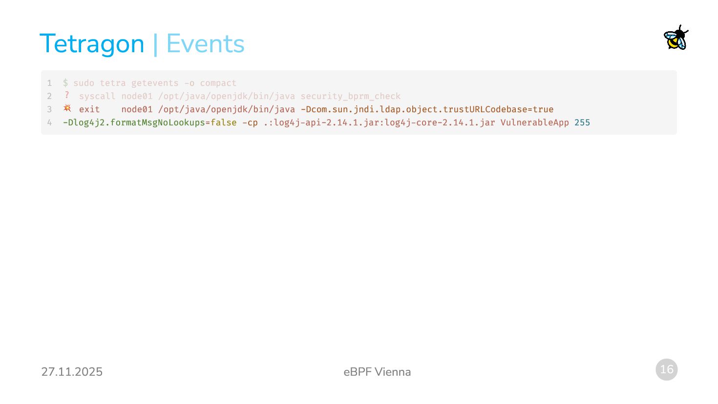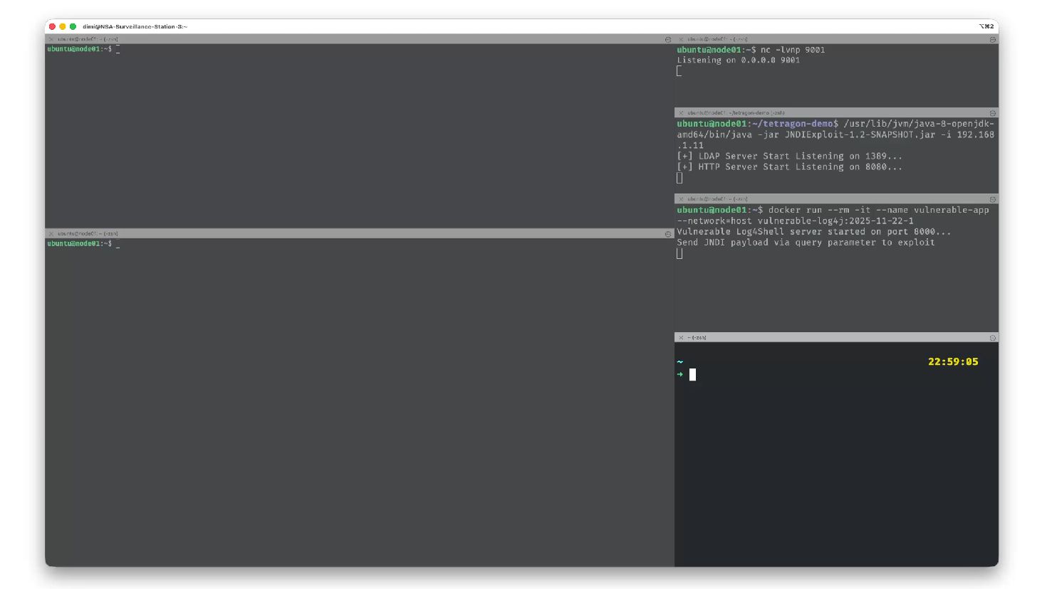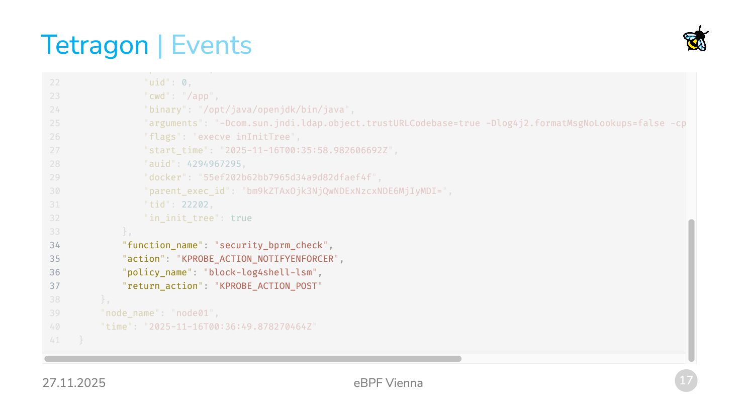 35 "action": "KPROBE_ACTION_NOTIFYENFORCER", 36 "policy_name": "block-log4shell-lsm", 37 "return_action": "KPROBE_ACTION_POST" p , 22 "uid": 0, 23 "cwd": "/app", 24 "binary": "/opt/java/openjdk/bin/java", 25 "arguments": "-Dcom.sun.jndi.ldap.object.trustURLCodebase=true -Dlog4j2.formatMsgNoLookups=false -cp 26 "flags": "execve inInitTree", 27 "start_time": "2025-11-16T00:35:58.982606692Z", 28 "auid": 4294967295, 29 "docker": "55ef202b62bb7965d34a9d82dfaef4f", 30 "parent_exec_id": "bm9kZTAxOjk3NjQwNDExNzcxNDE6MjIyMDI=", 31 "tid": 22202, 32 "in_init_tree": true 33 }, 38 }, 39 "node_name": "node01", 40 "time": "2025-11-16T00:36:49.878270464Z" 41 }