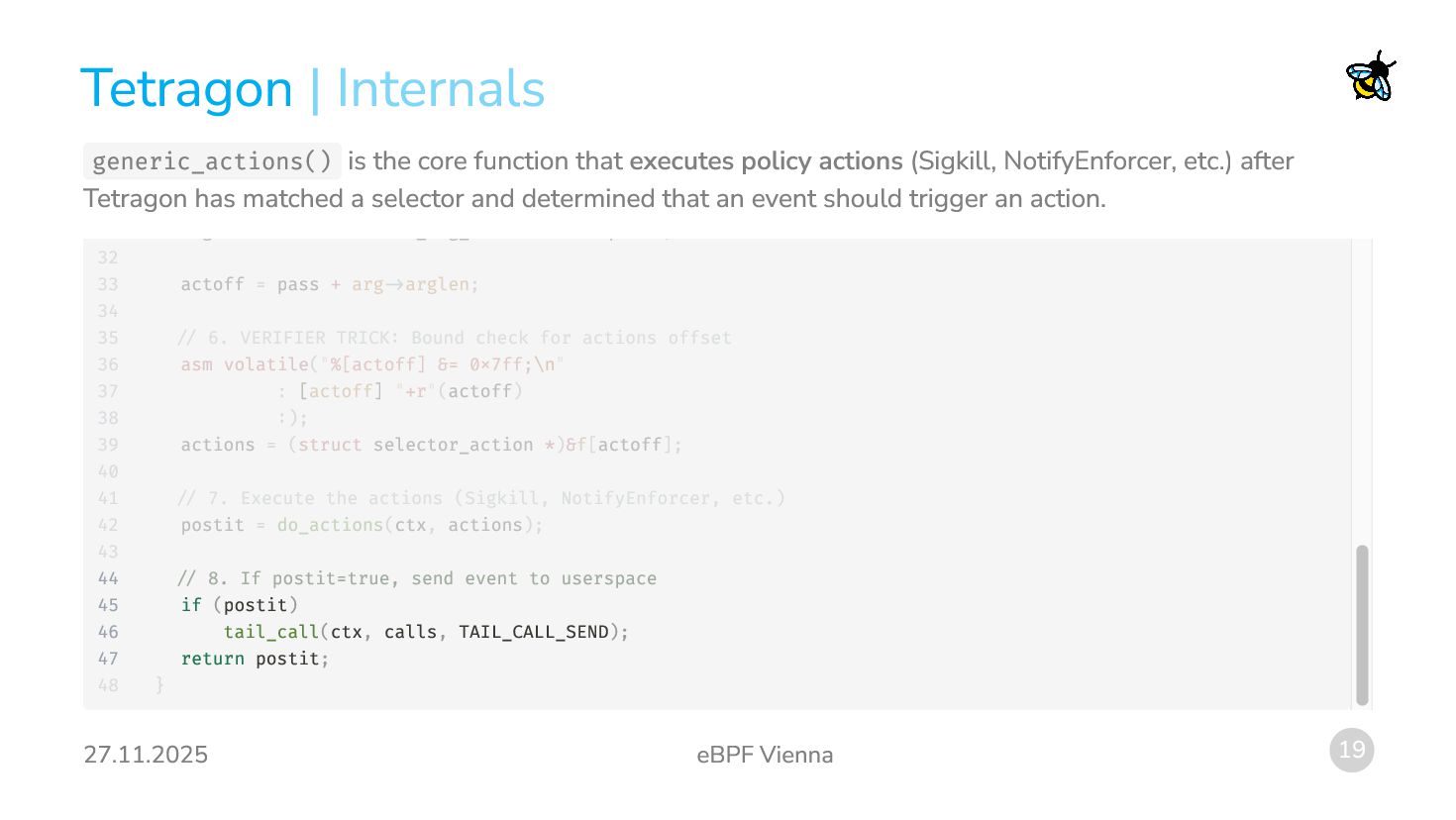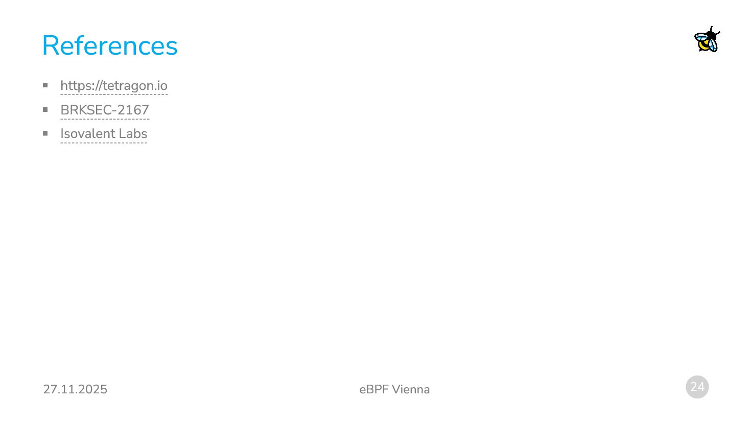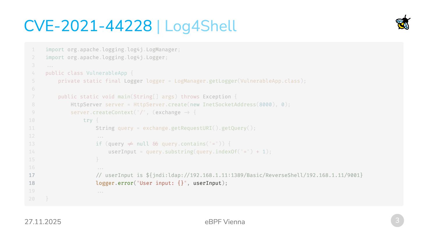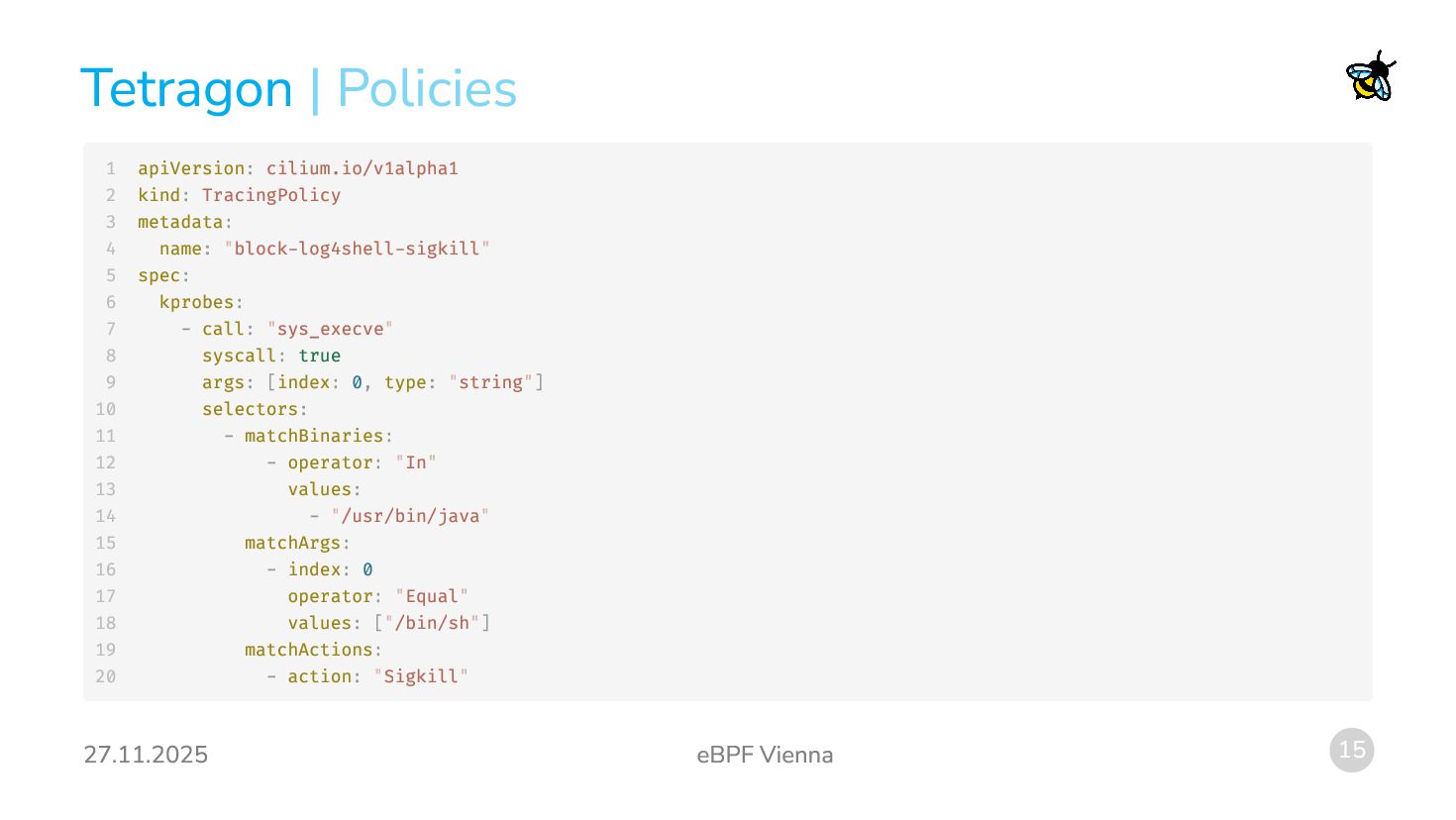 35 "action": "KPROBE_ACTION_NOTIFYENFORCER", 36 "policy_name": "block-log4shell-lsm", 37 "return_action": "KPROBE_ACTION_POST" p , 22 "uid": 0, 23 "cwd": "/app", 24 "binary": "/opt/java/openjdk/bin/java", 25 "arguments": "-Dcom.sun.jndi.ldap.object.trustURLCodebase=true -Dlog4j2.formatMsgNoLookups=false -cp 26 "flags": "execve inInitTree", 27 "start_time": "2025-11-16T00:35:58.982606692Z", 28 "auid": 4294967295, 29 "docker": "55ef202b62bb7965d34a9d82dfaef4f", 30 "parent_exec_id": "bm9kZTAxOjk3NjQwNDExNzcxNDE6MjIyMDI=", 31 "tid": 22202, 32 "in_init_tree": true 33 }, 38 }, 39 "node_name": "node01", 40 "time": "2025-11-16T00:36:49.878270464Z" 41 }