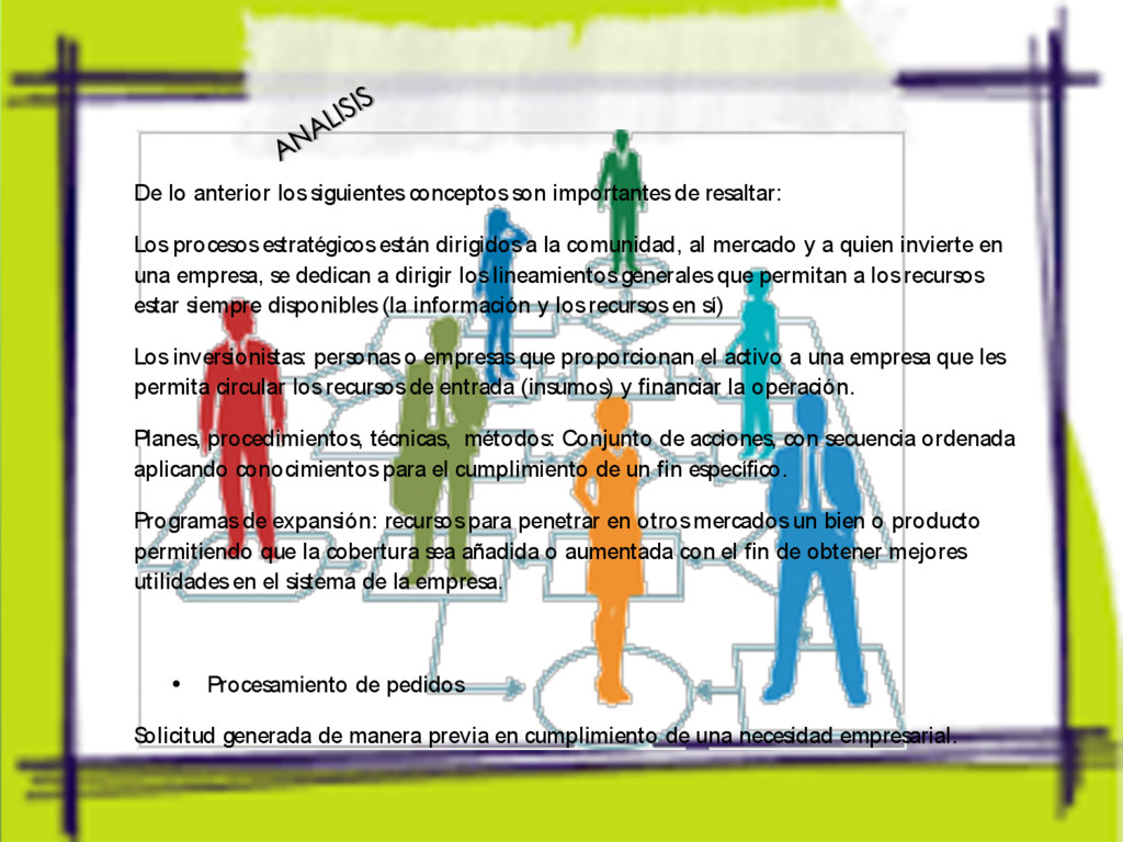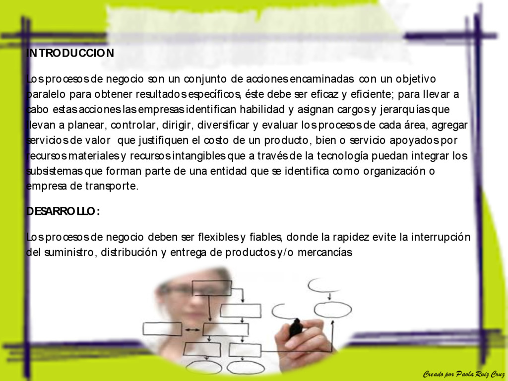 encaminadas con un objetivo paralelo para obtener resultados específicos, éste debe ser eficaz y eficiente; para llevar a cabo estas acciones las empresas identifican habilidad y asignan cargos y jerarquías que llevan a planear, controlar, dirigir, diversificar y evaluar los procesos de cada área, agregar servicios de valor que justifiquen el costo de un producto, bien o servicio apoyados por recursos materiales y recursos intangibles que a través de la tecnología puedan integrar los subsistemas que forman parte de una entidad que se identifica como organización o empresa de transporte. DES ARROLLO: Los procesos de negocio deben ser flexibles y fiables, donde la rapidez evite la interrupción del suministro, distribución y entrega de productos y/o mercancías Creado por Paola Ruiz Cruz