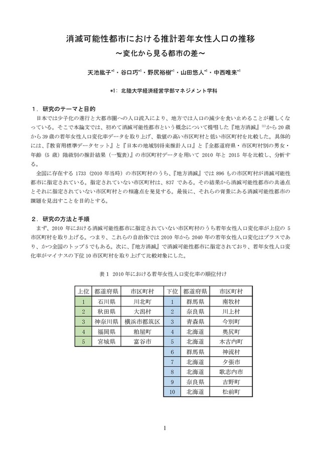1 消滅可能性都市における推計若年女性人口の推移 ~変化から見る都市の差~ 天池紘子*1・谷口巧*1・野尻裕樹*1・山田悠人*1・中西唯来*1 *1: 北陸大学経済経営学部マネジメント学科 1.研究のテーマと目的 日本では少子化の進行と大都市圏への人口流入により、地方では人口の減少を食い止めることが難しくな っている。そこで本論文では、初めて消滅可能性都市という概念について提唱した『地方消滅』(1)から 20