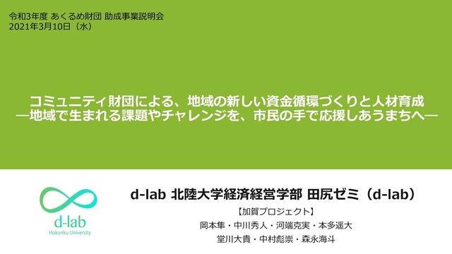 コミュニティ財団による、地域の新しい資金循環づくりと人材育成 ―地域で生まれる課題やチャレンジを、市民の手で応援しあうまちへ― d-lab 北陸大学経済経営学部 田尻ゼミ(d-lab) 【加賀プロジェクト】 岡本隼・中川秀人・河端克実・本多遥大 堂川大貴・中村彪崇・森永海斗 令和3年度 あくるめ財団