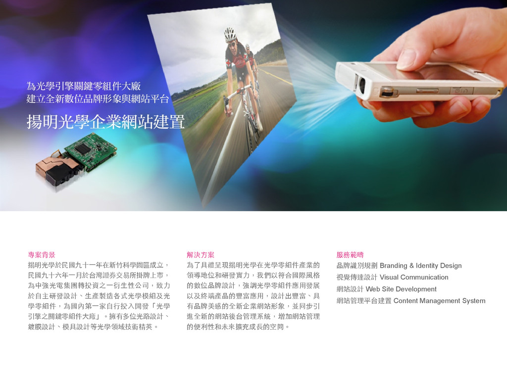 Branding & Identity Design 視覺傳達設計 Visual Communication 網站設計 Web Site Development 網站管理平台建置 Content Management System 解決⽅方案 為了具體呈現揚明光學在光學零組件產業的 領導地位和研發實⼒力,我們以符合國際⾵風格 的數位品牌設計,強調光學零組件應⽤用發展 以及終端產品的豐富應⽤用,設計出豐富、具 有品牌美感的全新企業網站形象,並同步引 進全新的網站後台管理系統,增加網站管理 的便利性和未來擴充成⻑⾧長的空間。