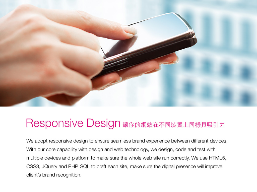 brand experience between different devices. With our core capability with design and web technology, we design, code and test with multiple devices and platform to make sure the whole web site run correctly. We use HTML5, CSS3, JQuery and PHP, SQL to craft each site, make sure the digital presence will improve client’s brand recognition.