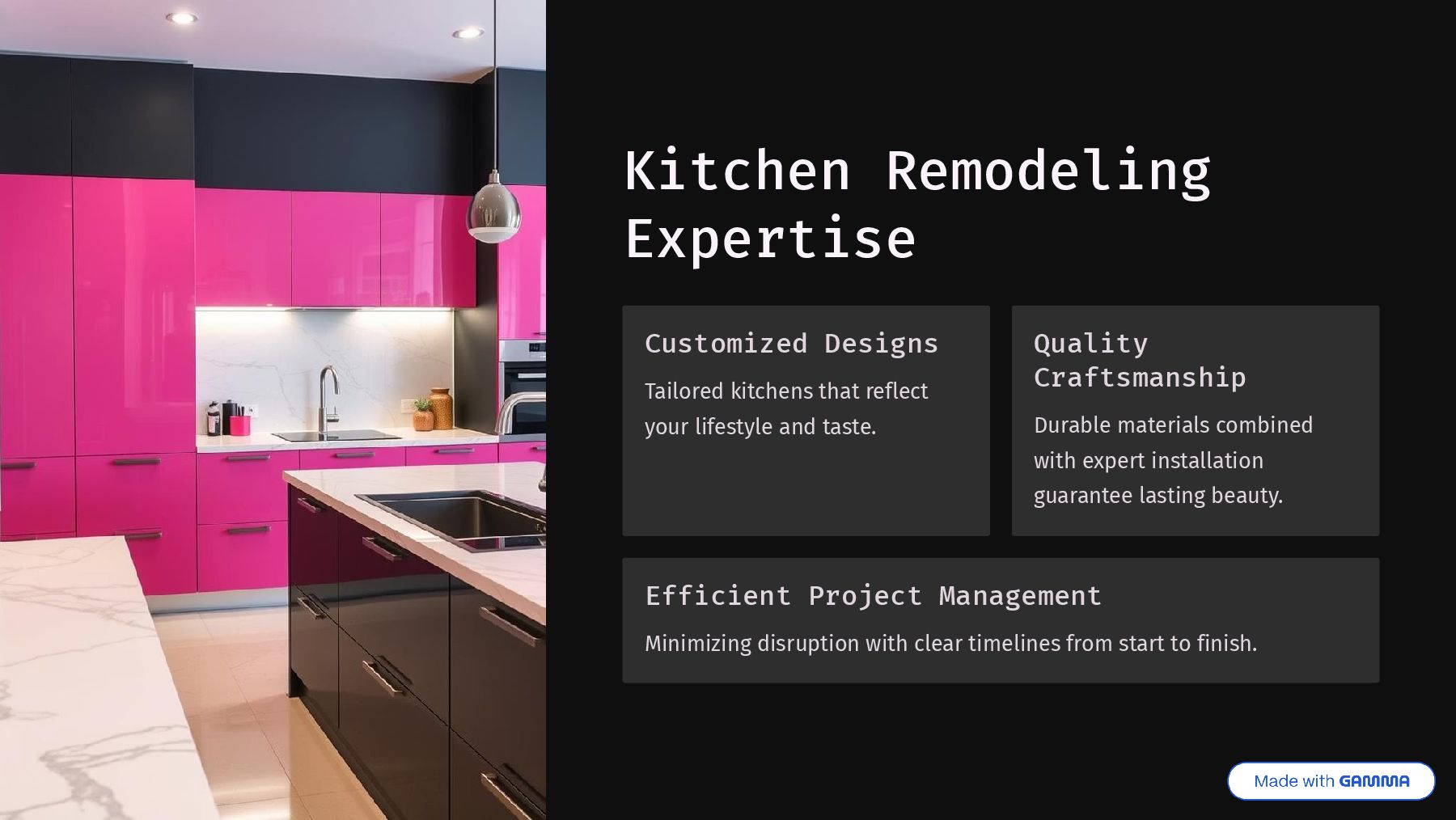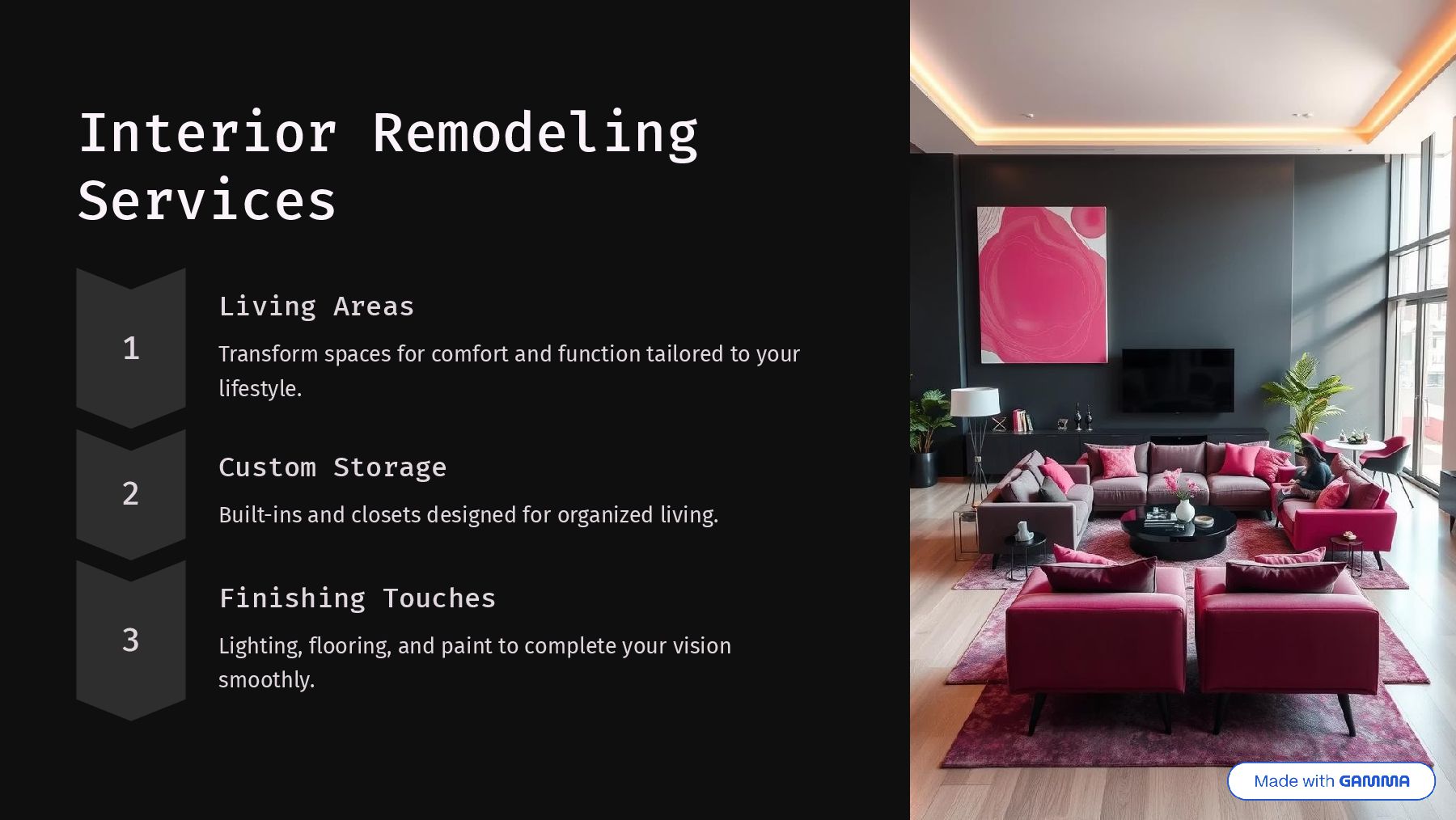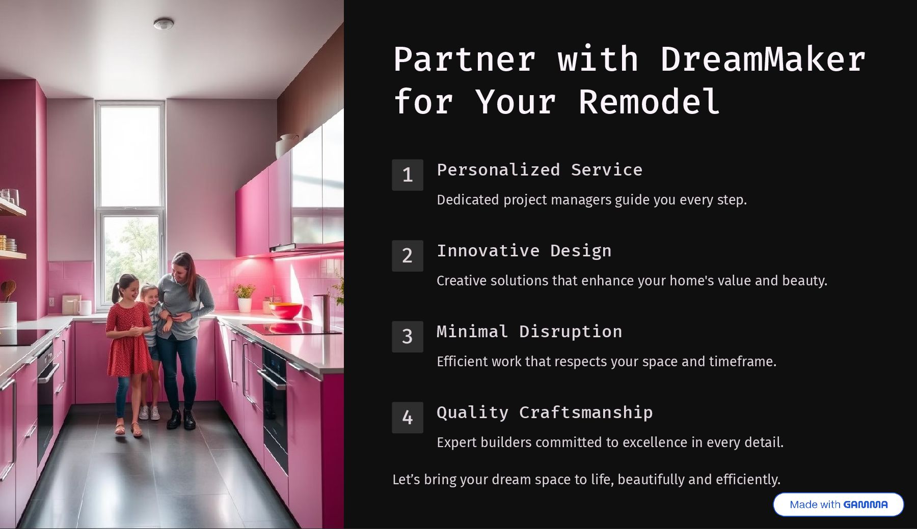 project managers guide you every step. 2 Innovative Design Creative solutions that enhance your home's value and beauty. 3 Minimal Disruption Efficient work that respects your space and timeframe. 4 Quality Craftsmanship Expert builders committed to excellence in every detail. Let9s bring your dream space to life, beautifully and efficiently.
