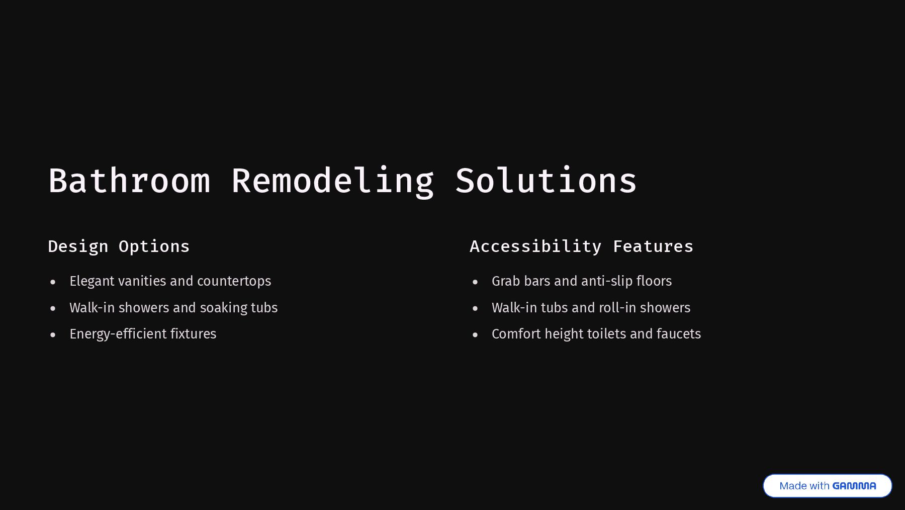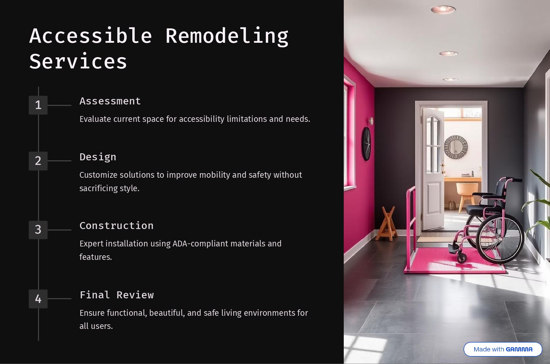 limitations and needs. 2 Design Customize solutions to improve mobility and safety without sacrificing style. 3 Construction Expert installation using ADA-compliant materials and features. 4 Final Review Ensure functional, beautiful, and safe living environments for all users.