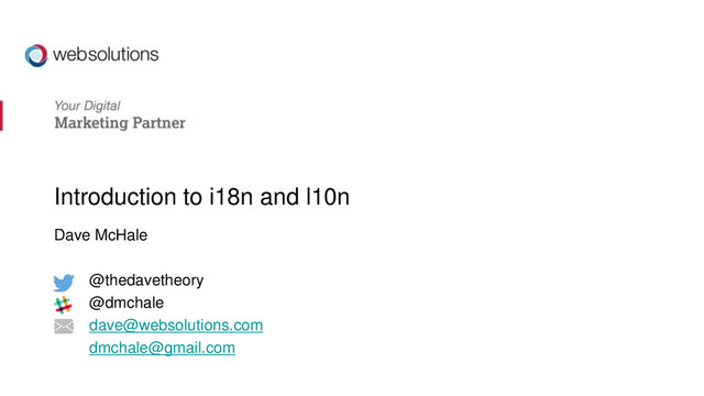 onalization/ – https://developer.wordpress.org/themes/function ality/localization/ – https://make.wordpress.org/polyglots/handbook/ • Otto’s Blog - http://ottopress.com/tag/i18n/ • Slack – #meta-i18n and #polyglots • WP Repository – https://wordpress.org/plugins/ – https://wordpress.org/themes/ • Google! Contact • [email protected][email protected] • @thedavetheory on Twitter • @dmchale on Slack • http://www.binarytemplar.com All images are the property and copyright of their original owners. No ownership is claimed by their use in this presentation