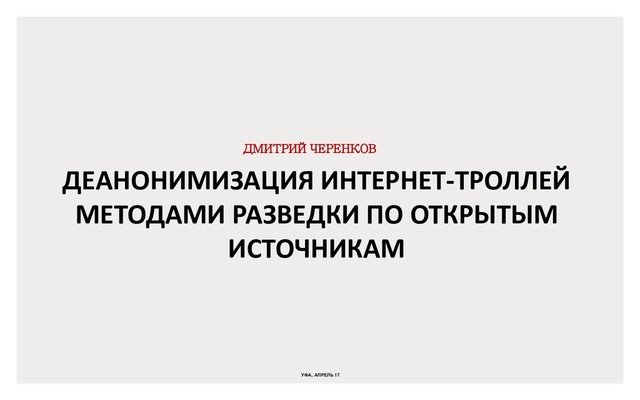 Деанонимизация интернет-троллей методами разведки по открытым источникам. Автор Черенков Дмитрий Анатольевич, г.Уфа. Презентация впервые представлена на II Международной научно-практической конференции «Актуальные вопросы исследования социальной сети», 20-21 апреля 2017 года, г. Уфа, Республика Башкортостан