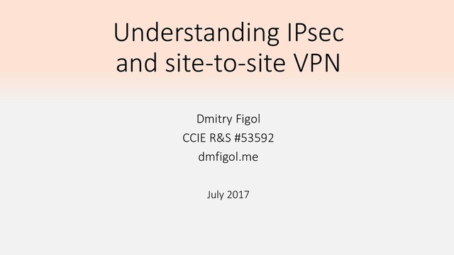 Presentation about IPsec and site-to-site VPNs. Both IKEv1 and IKEv2 are covered, as well as policy-based and route-based VPNs (GRE over IPsec, VTI, DMVPN, FlexVPN). Also configuration examples for site-to-site policy-based VPNs, GRE over IPsec and DVTI are included.