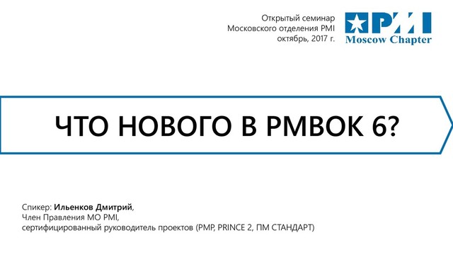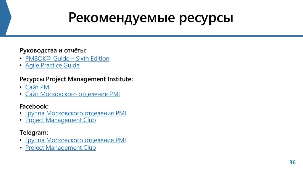 Sixth Edition • Agile Practice Guide Ресурсы Project Management Institute: • Сайт PMI • Cайт Московского отделения PMI Facebook: • Группа Московского отделения PMI • Project Management Club Тelegram: • Группа Московского отделения PMI • Project Management Club