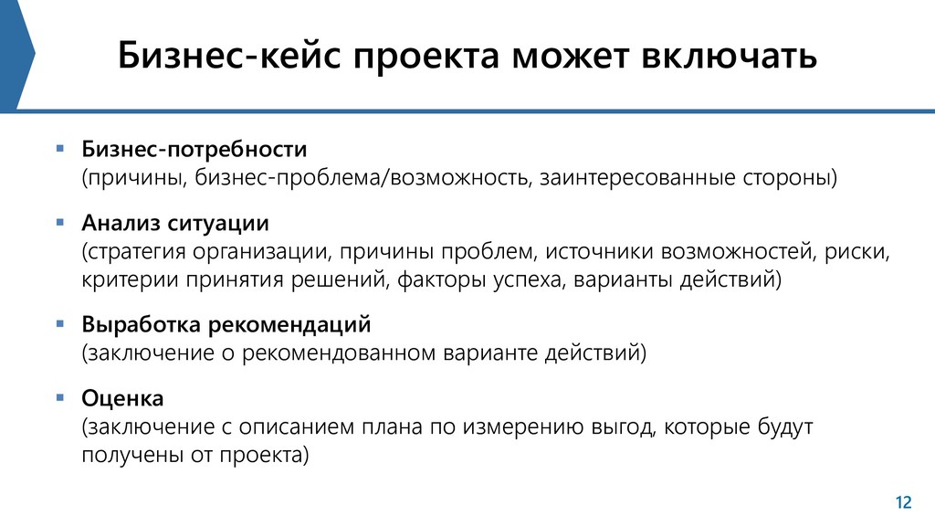 стороны) Анализ ситуации (стратегия организации, причины проблем, источники возможностей, риски, критерии принятия решений, факторы успеха, варианты действий) Выработка рекомендаций (заключение о рекомендованном варианте действий) Оценка (заключение с описанием плана по измерению выгод, которые будут получены от проекта)