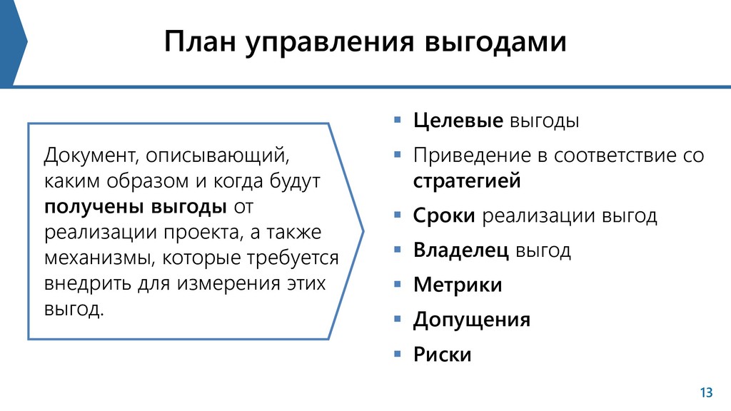 соответствие со стратегией Сроки реализации выгод Владелец выгод Метрики Допущения Риски Документ, описывающий, каким образом и когда будут получены выгоды от реализации проекта, а также механизмы, которые требуется внедрить для измерения этих выгод.