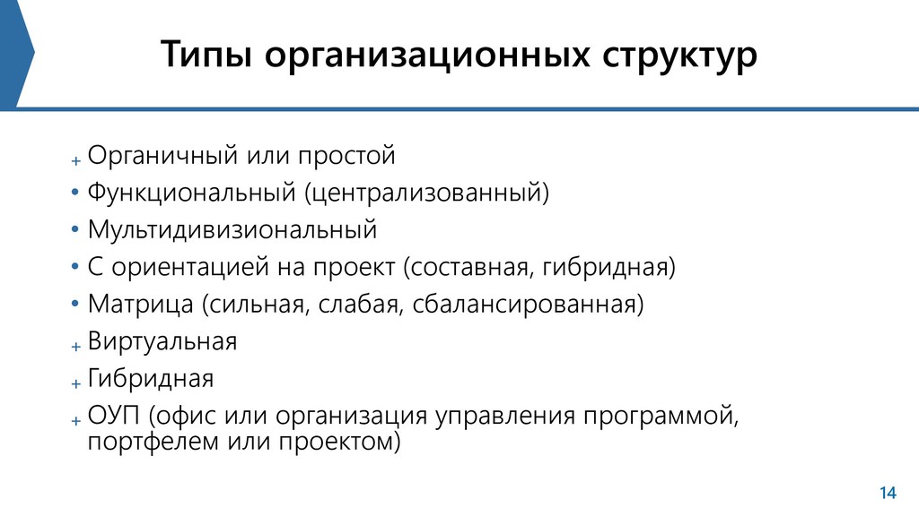 С ориентацией на проект (составная, гибридная) • Матрица (сильная, слабая, сбалансированная) ₊ Виртуальная ₊ Гибридная ₊ ОУП (офис или организация управления программой, портфелем или проектом) 14 Типы организационных структур