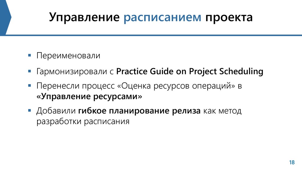 on Project Scheduling Перенесли процесс «Оценка ресурсов операций» в «Управление ресурсами» Добавили гибкое планирование релиза как метод разработки расписания 18