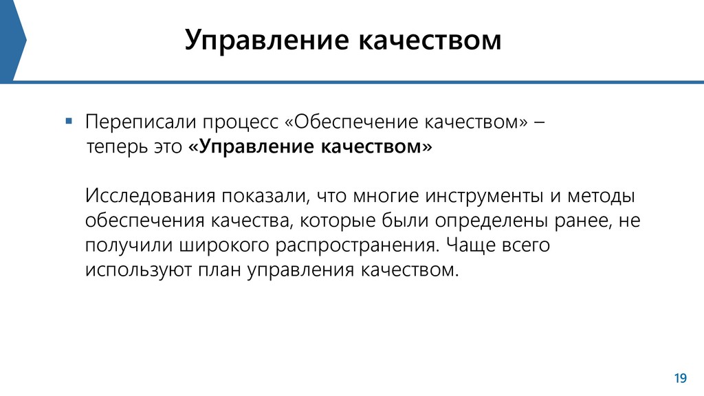 «Управление качеством» Исследования показали, что многие инструменты и методы обеспечения качества, которые были определены ранее, не получили широкого распространения. Чаще всего используют план управления качеством. 19